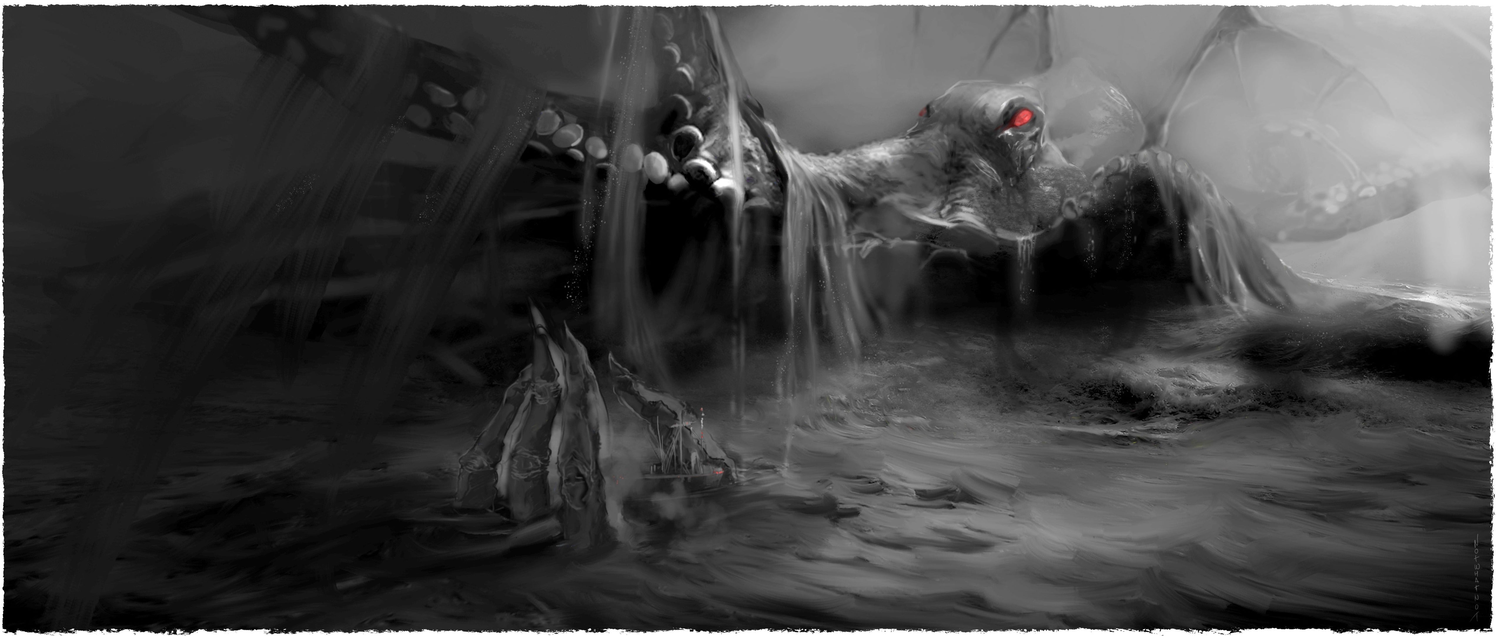 Cthulhu rises from the depths, a colossal kraken-like figure commanding the ocean with terrifying presence. Cradled in its immense palm is a lone fisherman’s boat, dwarfed and fragile against the cosmic power above. Water cascades from the creature’s head in silvery torrents, while a subtle red glow from its eyes mirrors the faint red lights on the vessel, heightening the tension between human vulnerability and otherworldly might. Rendered with haunting detail, the piece captures the sublime terror and mesmerizing beauty of a world where myth and reality converge.