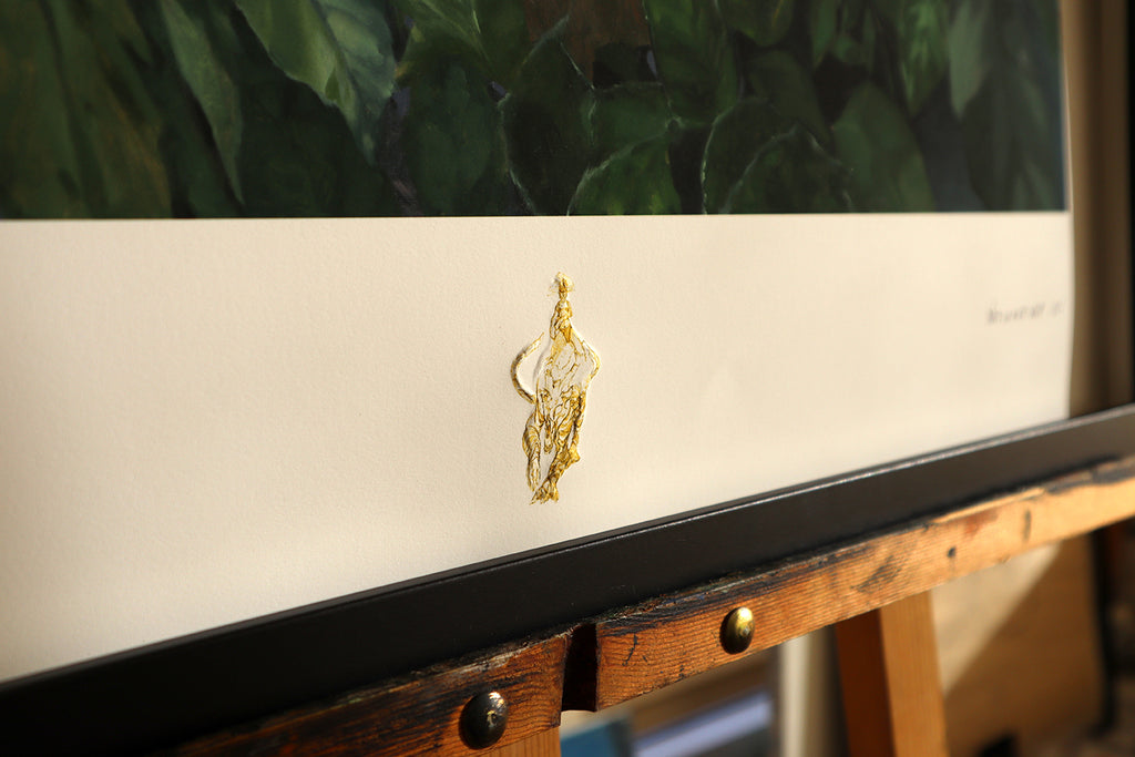 The 24 x 36 in artwork is produced locally in a Montreal photo lab, the bottom insignia is embossed to further emphasize the relief. This insignia is a miniature of the original sketch for this artwork. Each print is then numbered, identified, and signed by hand.