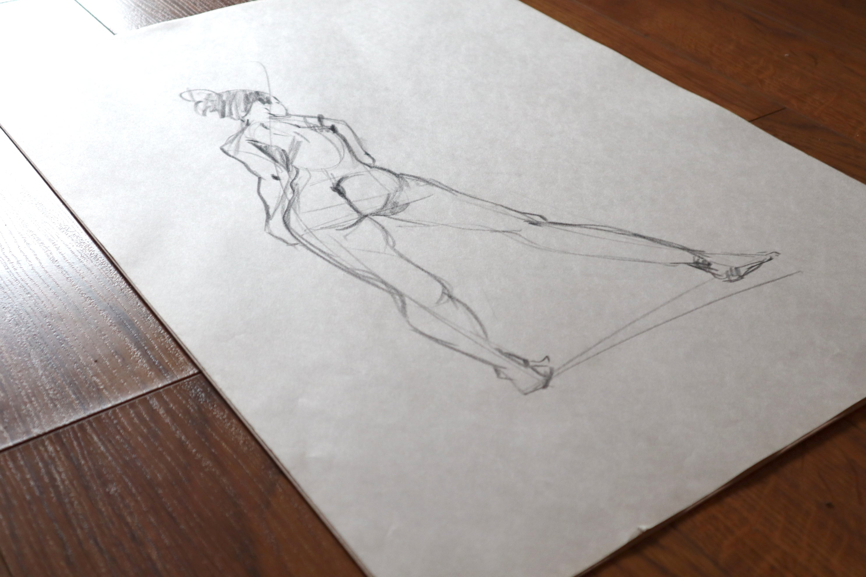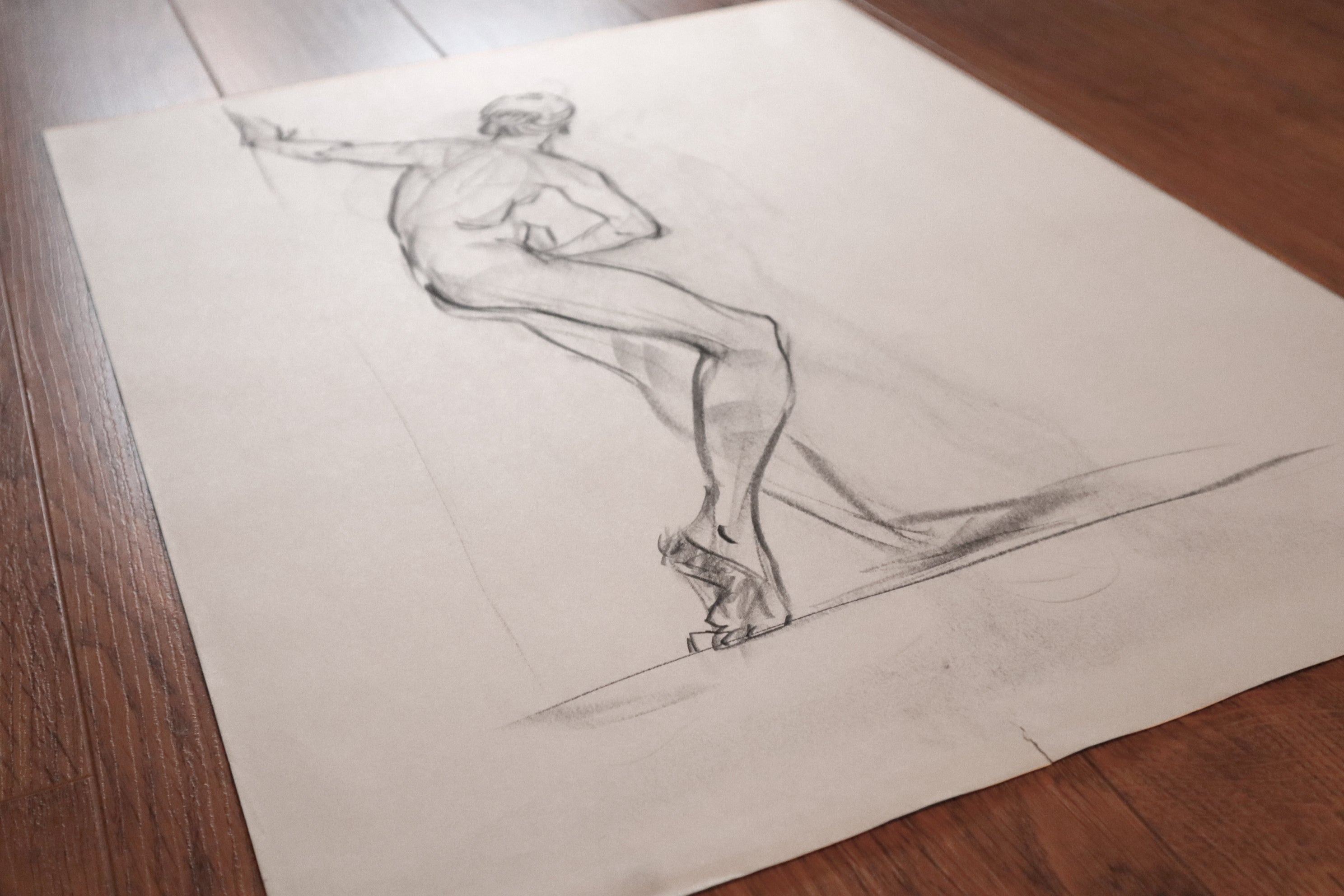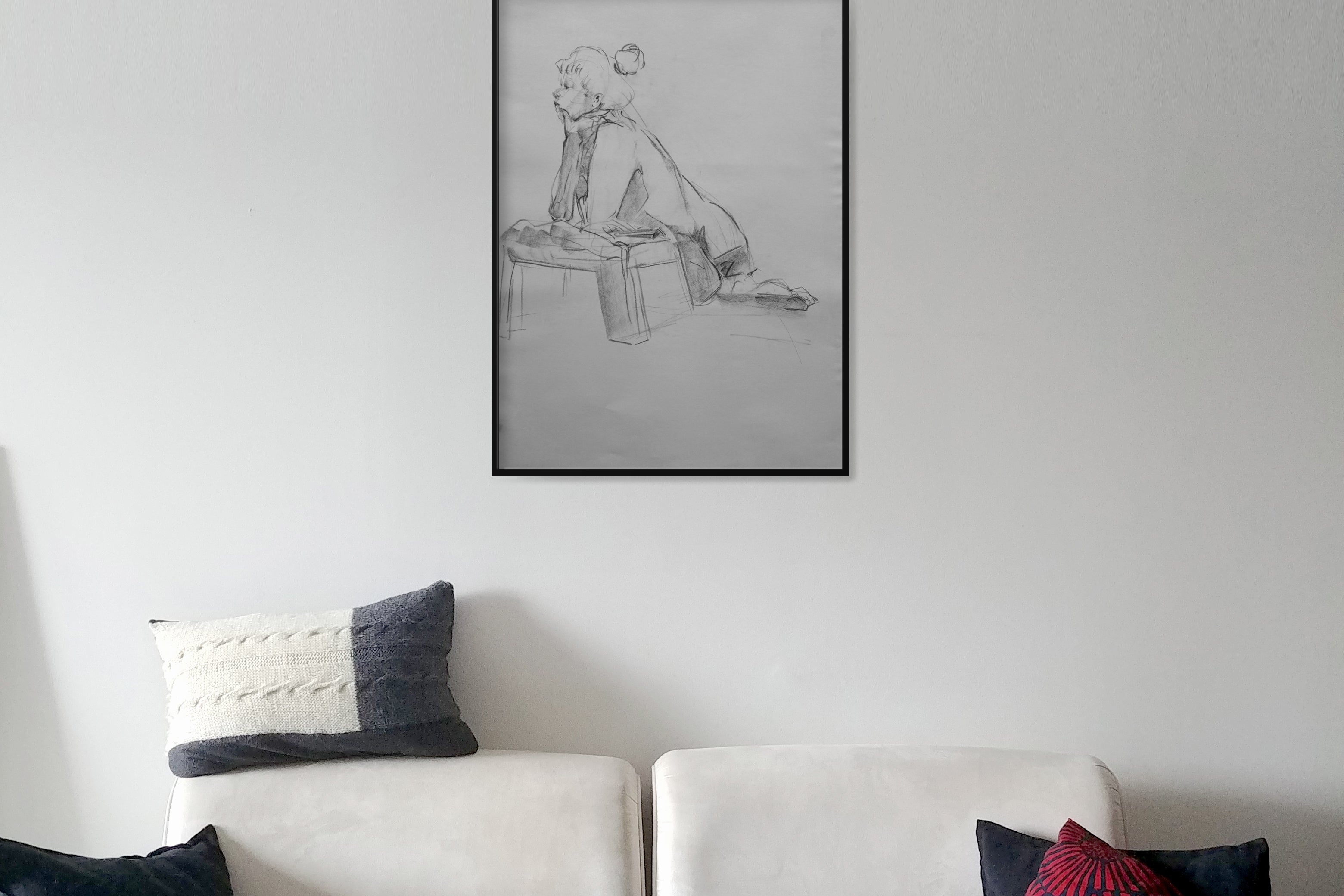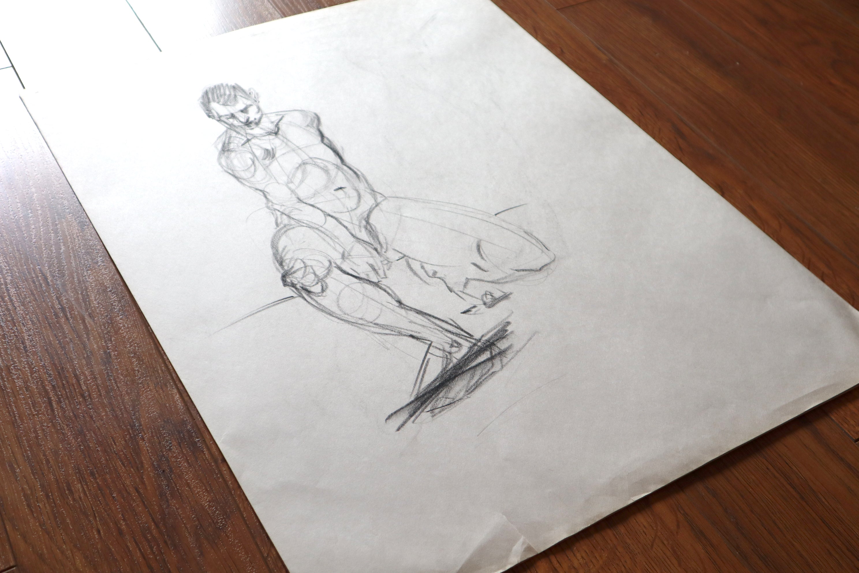 Original Large format charcoal drawings from a live model session and small pencil sketches from imagination.