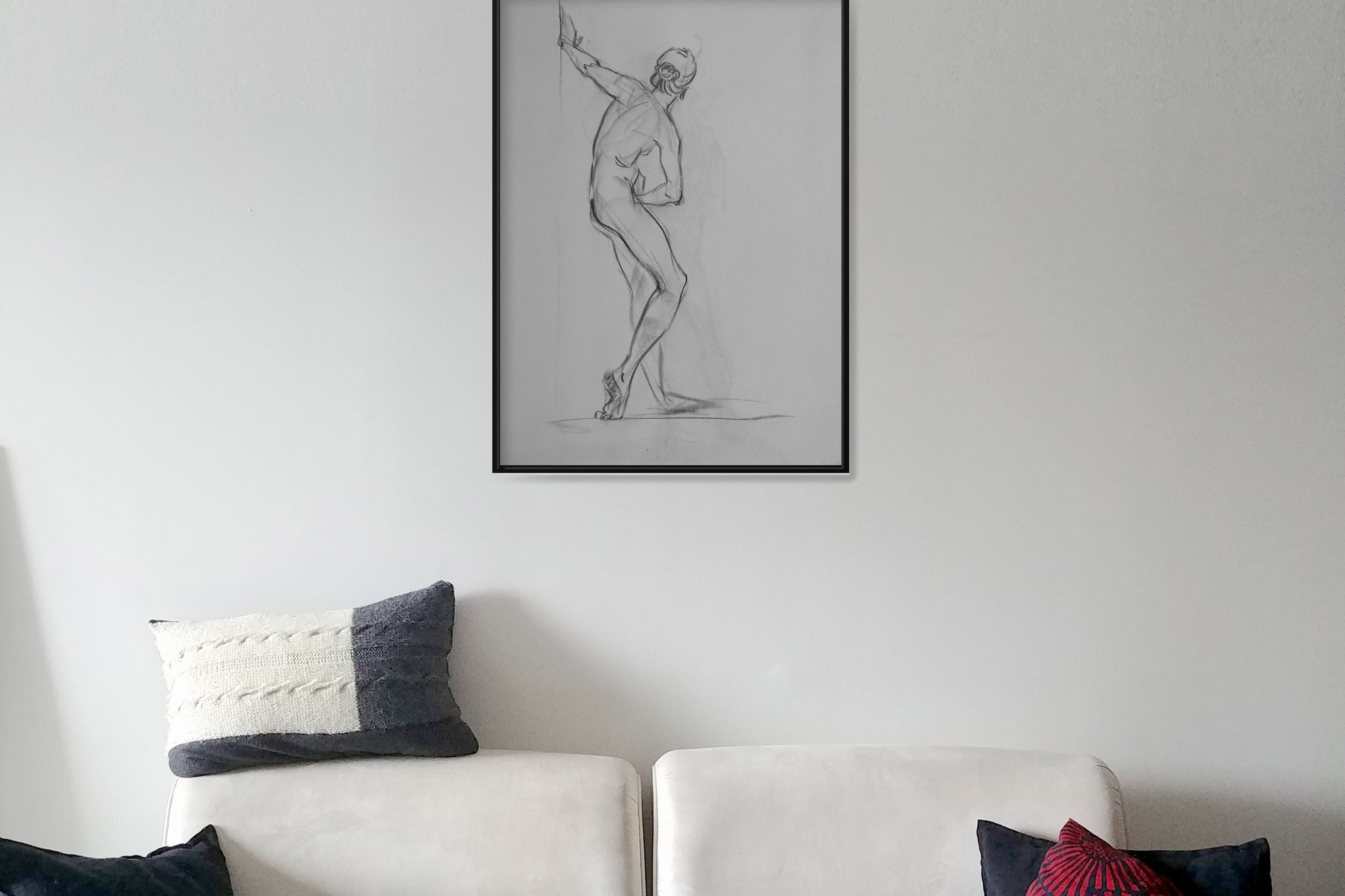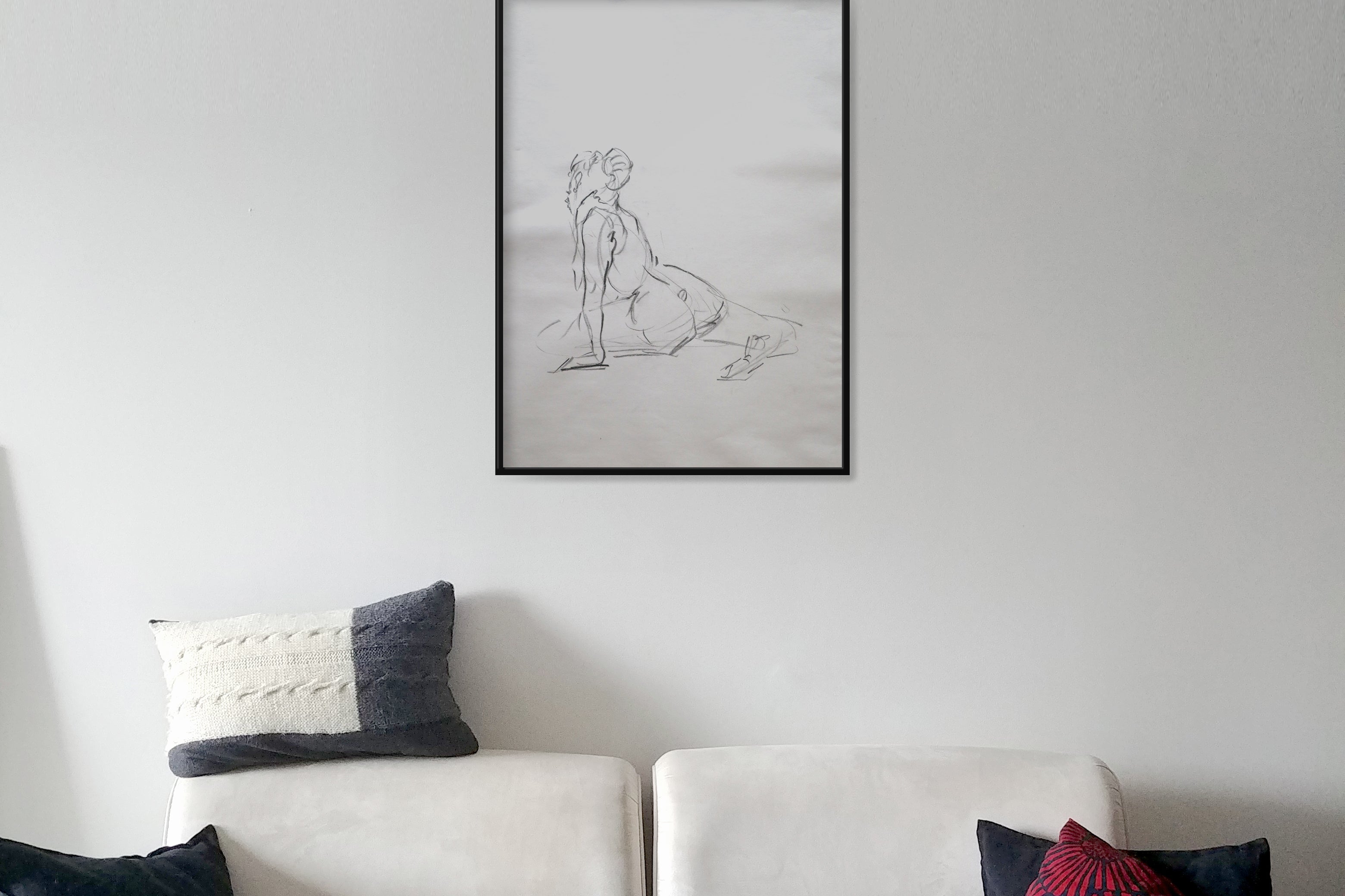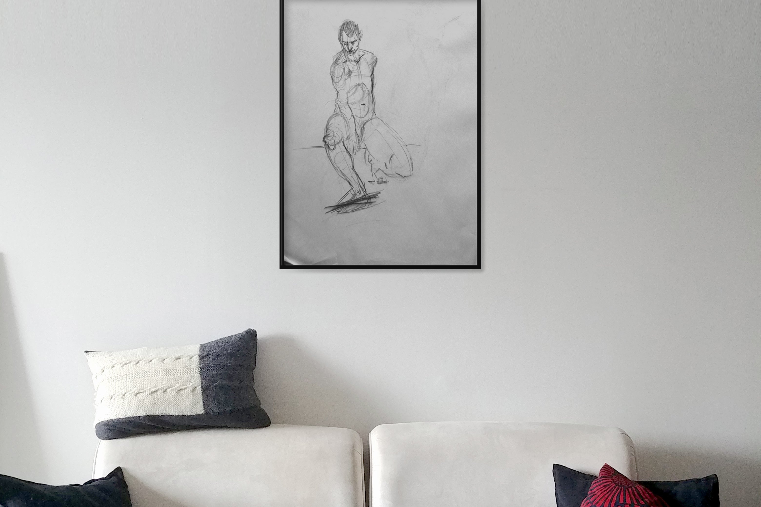 Original Large format charcoal drawings from a live model session and small pencil sketches from imagination.