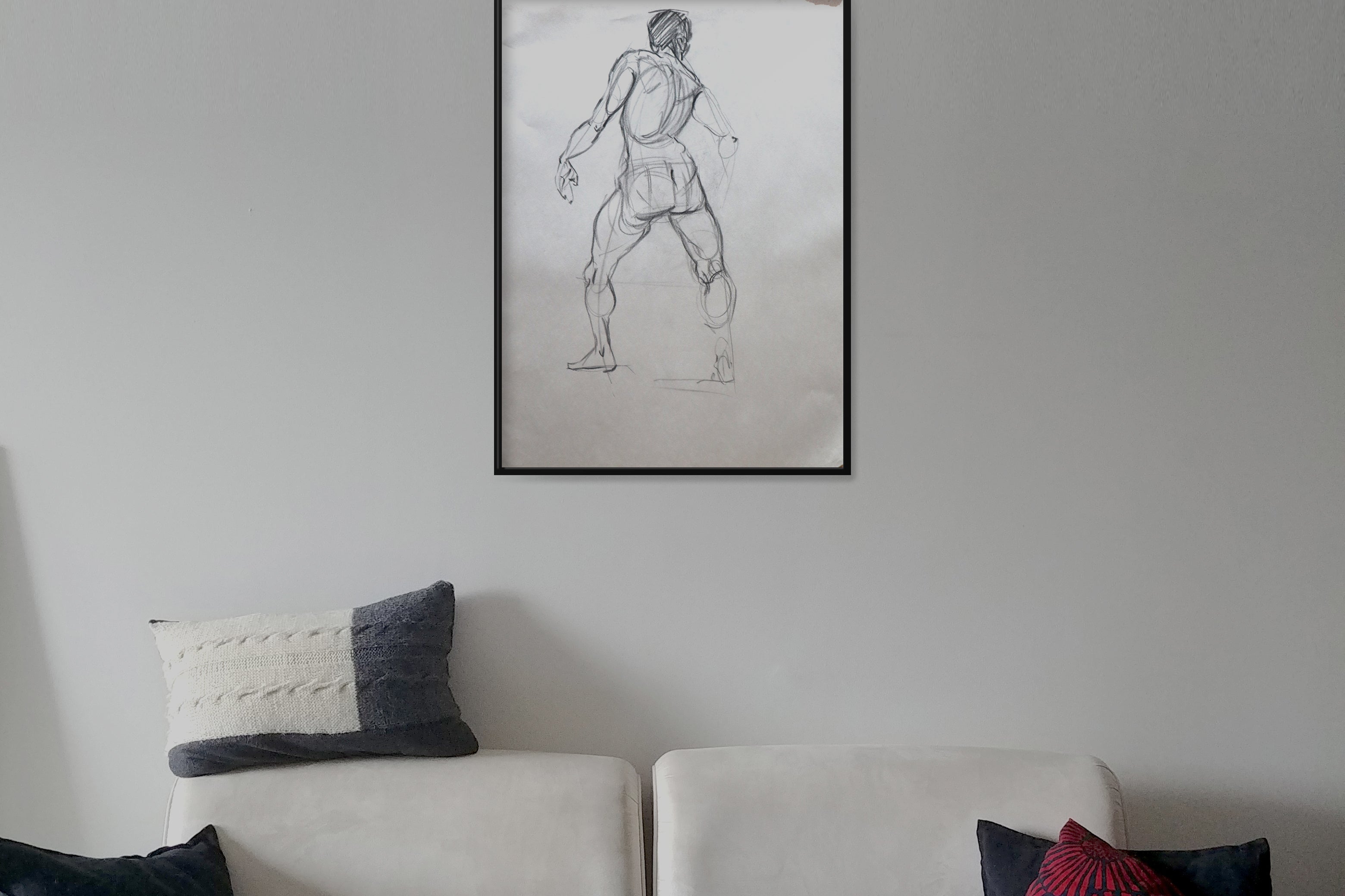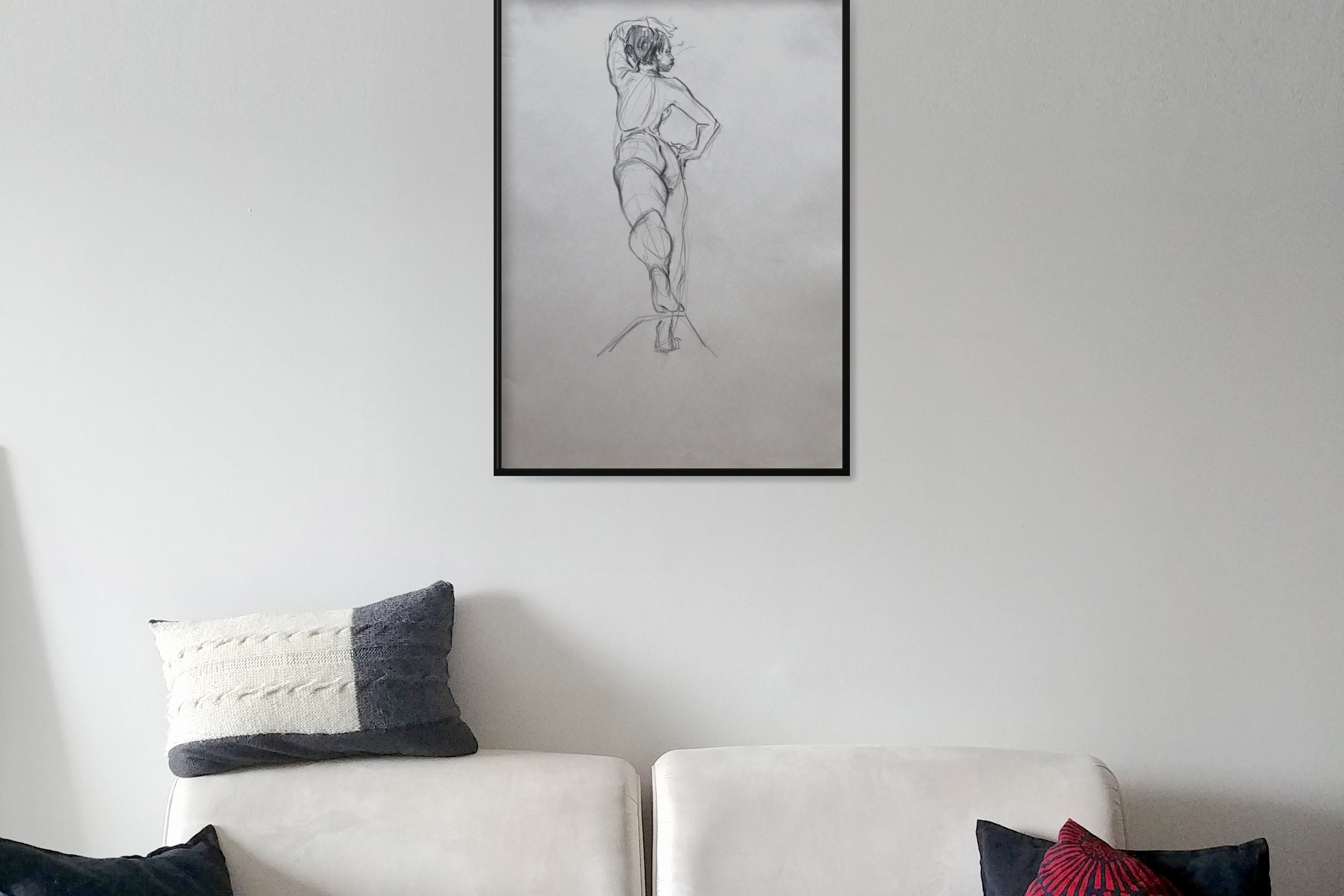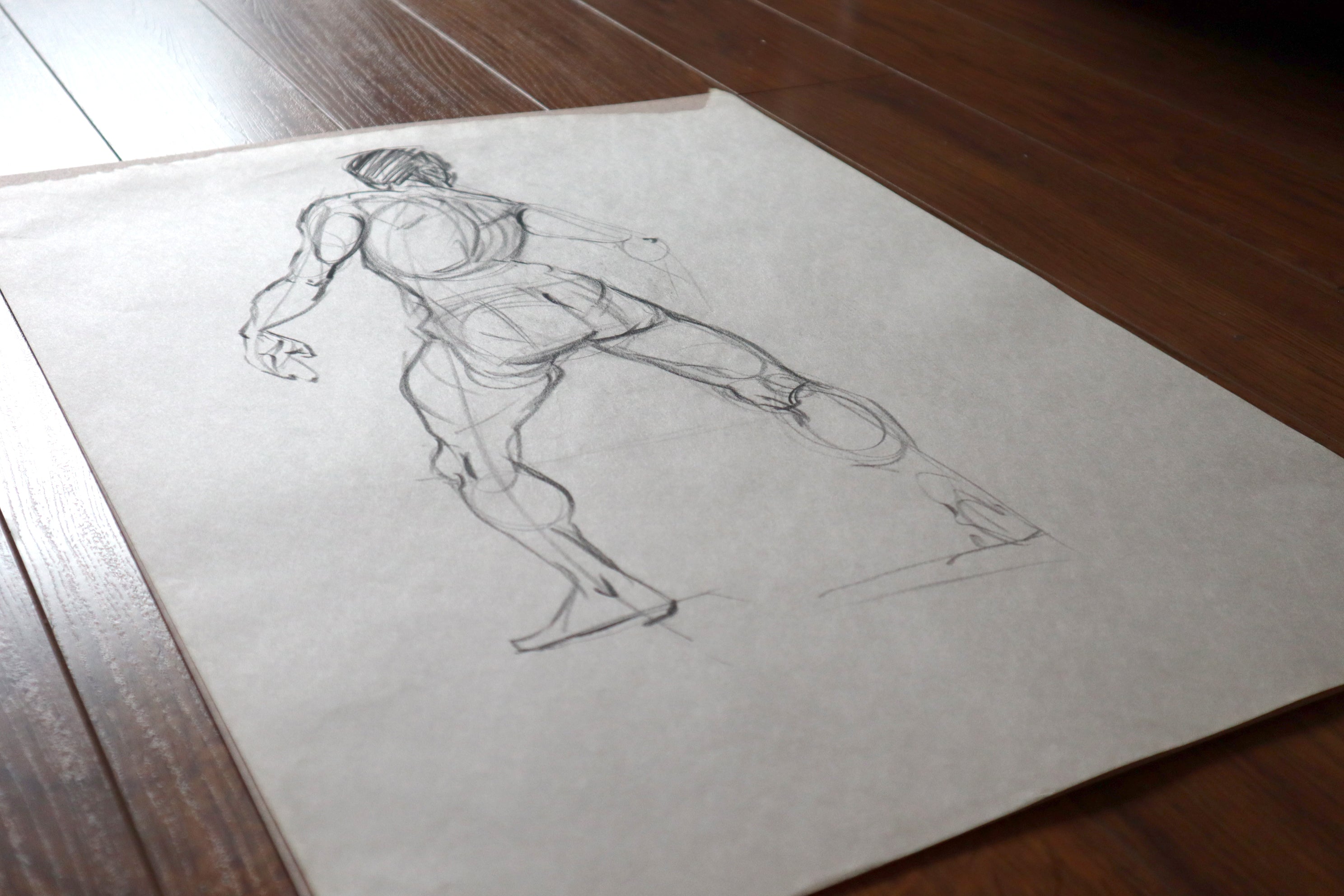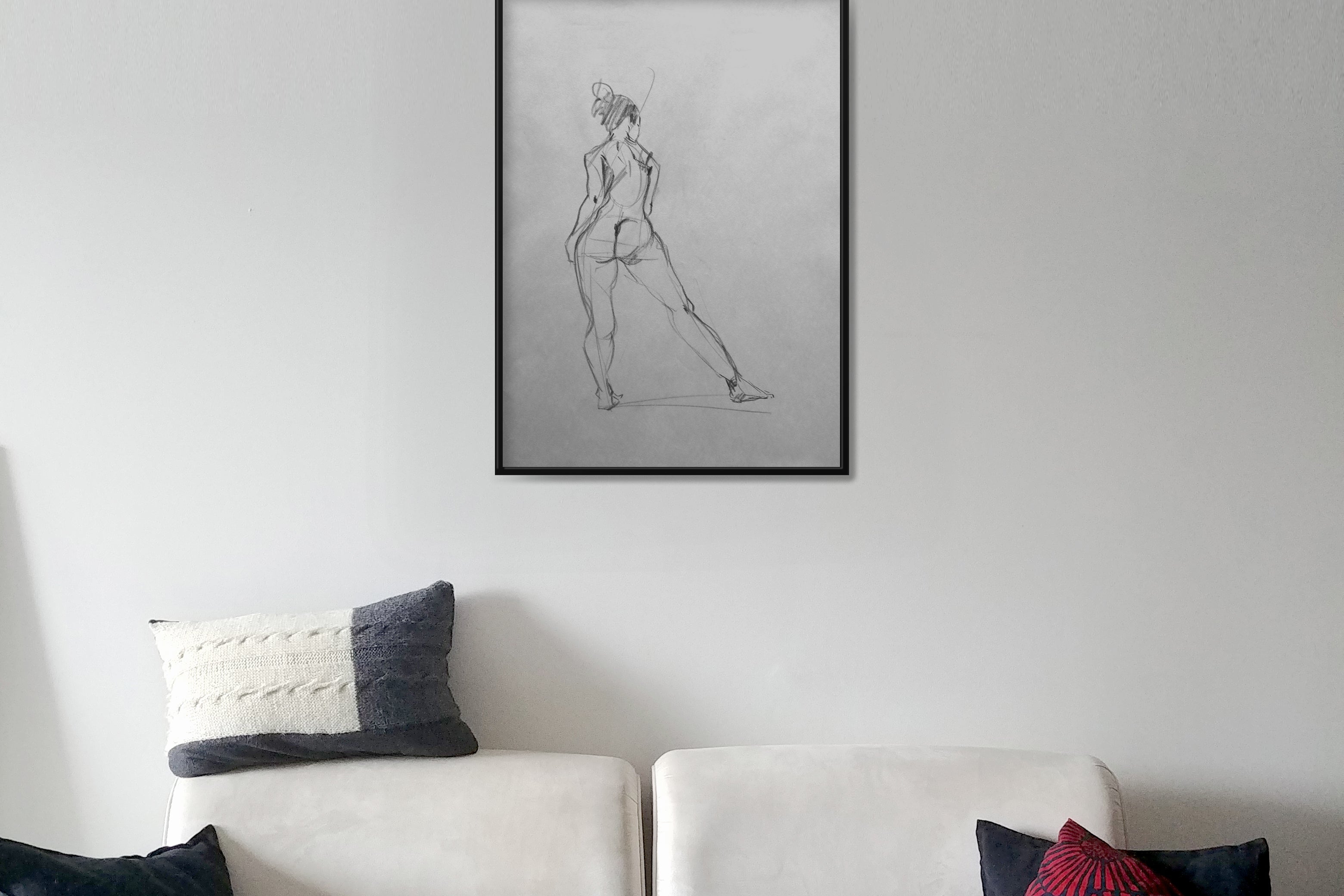 Original Large format charcoal drawings from a live model session and small pencil sketches from imagination.