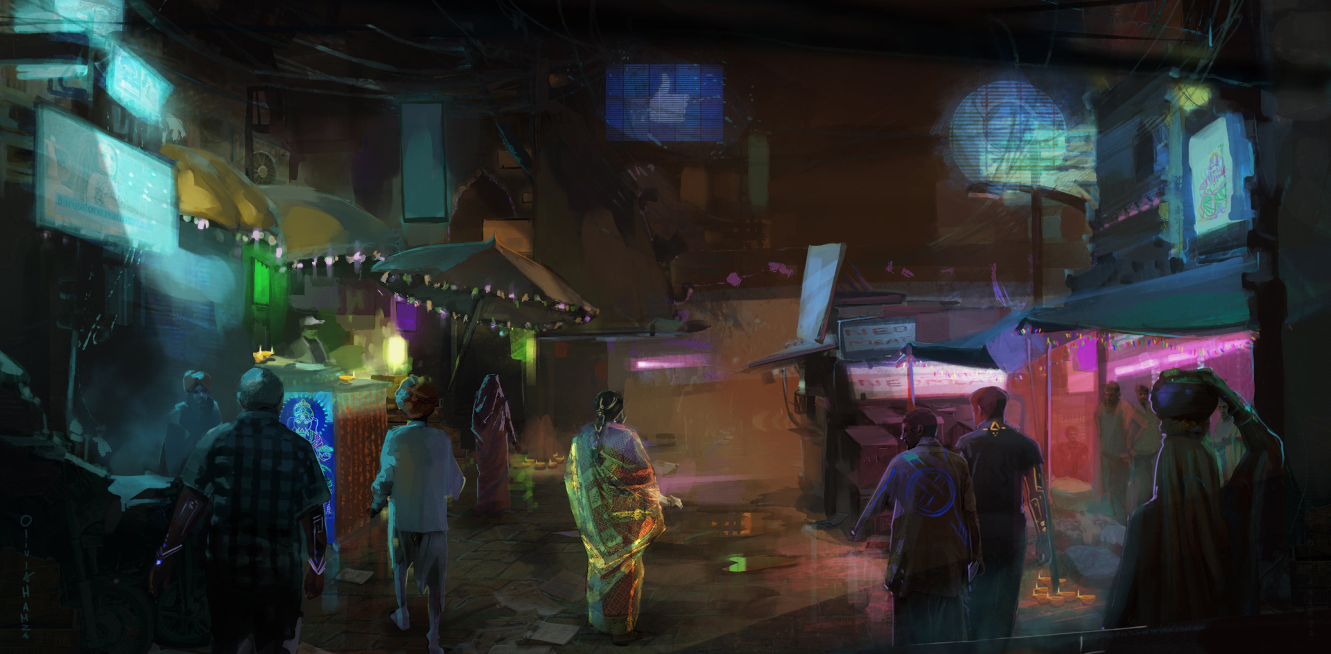 Neon-lit, cyberpunk vision of a future Bangalore market.