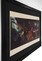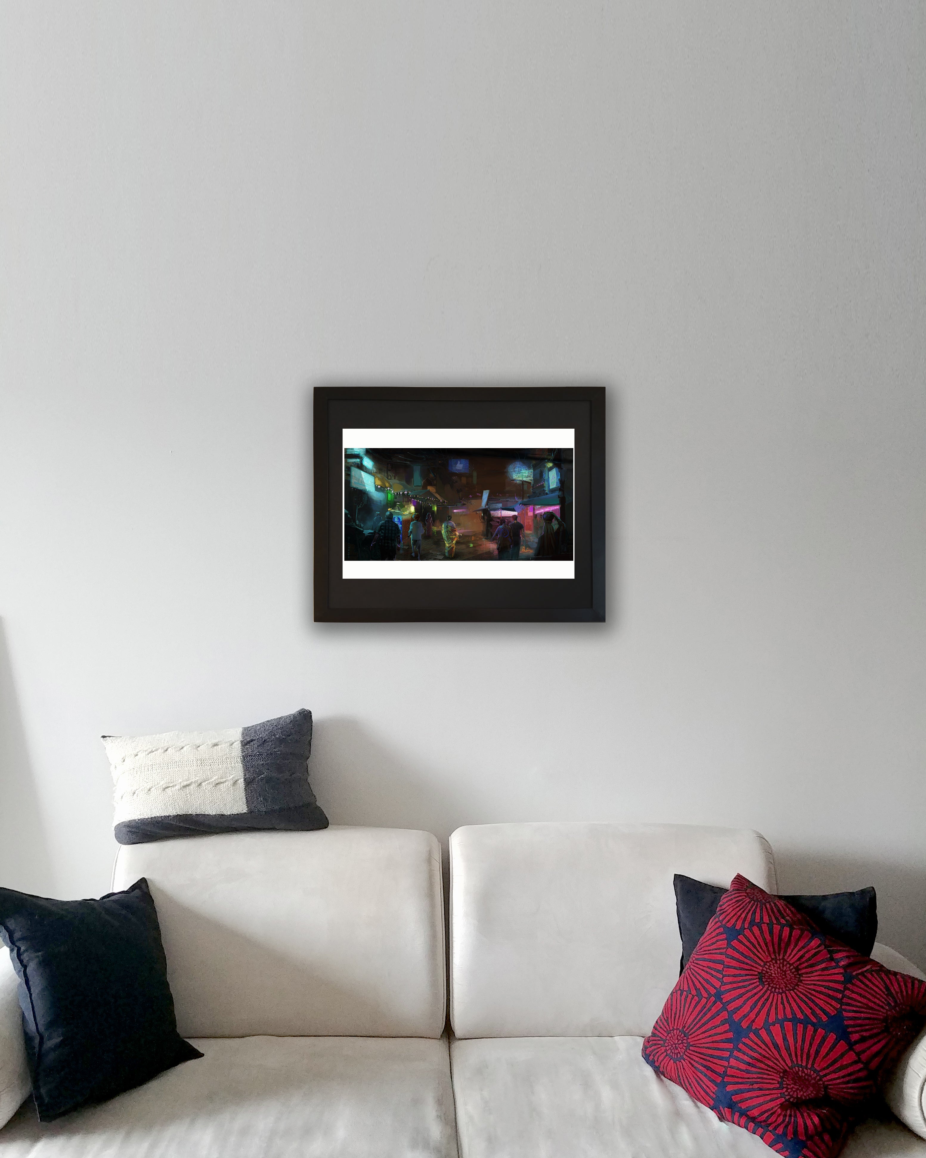 Near-future Bangalore; where tradition and technology coexist in vivid, electric tension. This cyberpunk-inspired painting reimagines an Indian bazaar glowing with neon light, its streets alive with the pulse of a dense population. Amid holographic signs and dense atmosphere, you’ll find the warmth of saris in motion, the soft glow of Indian oil lamps, and reverent nods to beloved deities. These symbols anchor the future in the richness of its past.