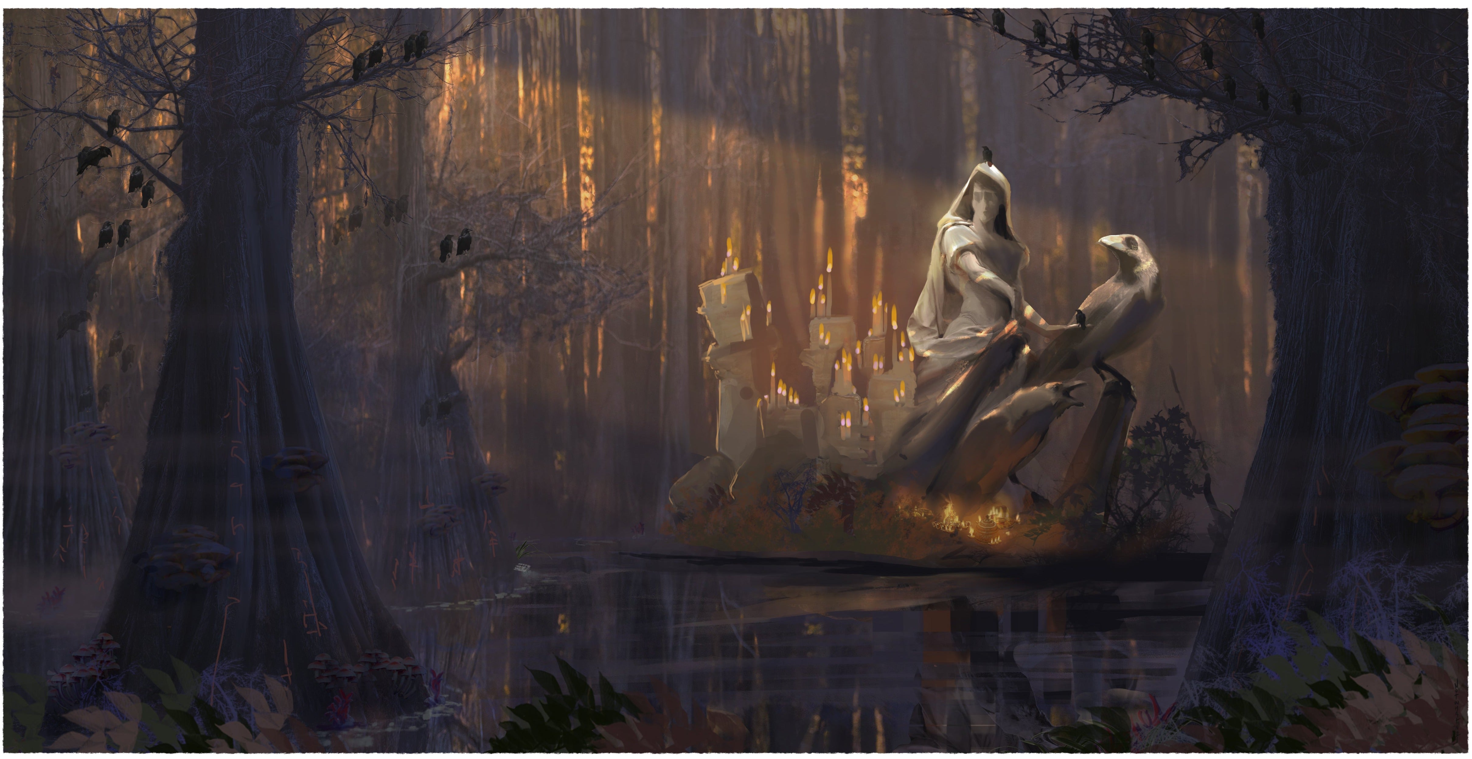 Hidden deep within an enchanted forest, a stone-carved statue of a woman rises from a tiny island in a shadowed swamp. Surrounded by silent crows and the remnants of devotion. Votive lamps and offerings scatter across the shrine, their soft warmth echoing centuries of reverence. Rich tones of deep orange and purple evoke a mystical twilight, while a single bright beam of light illuminates the statue, casting it in sacred focus.