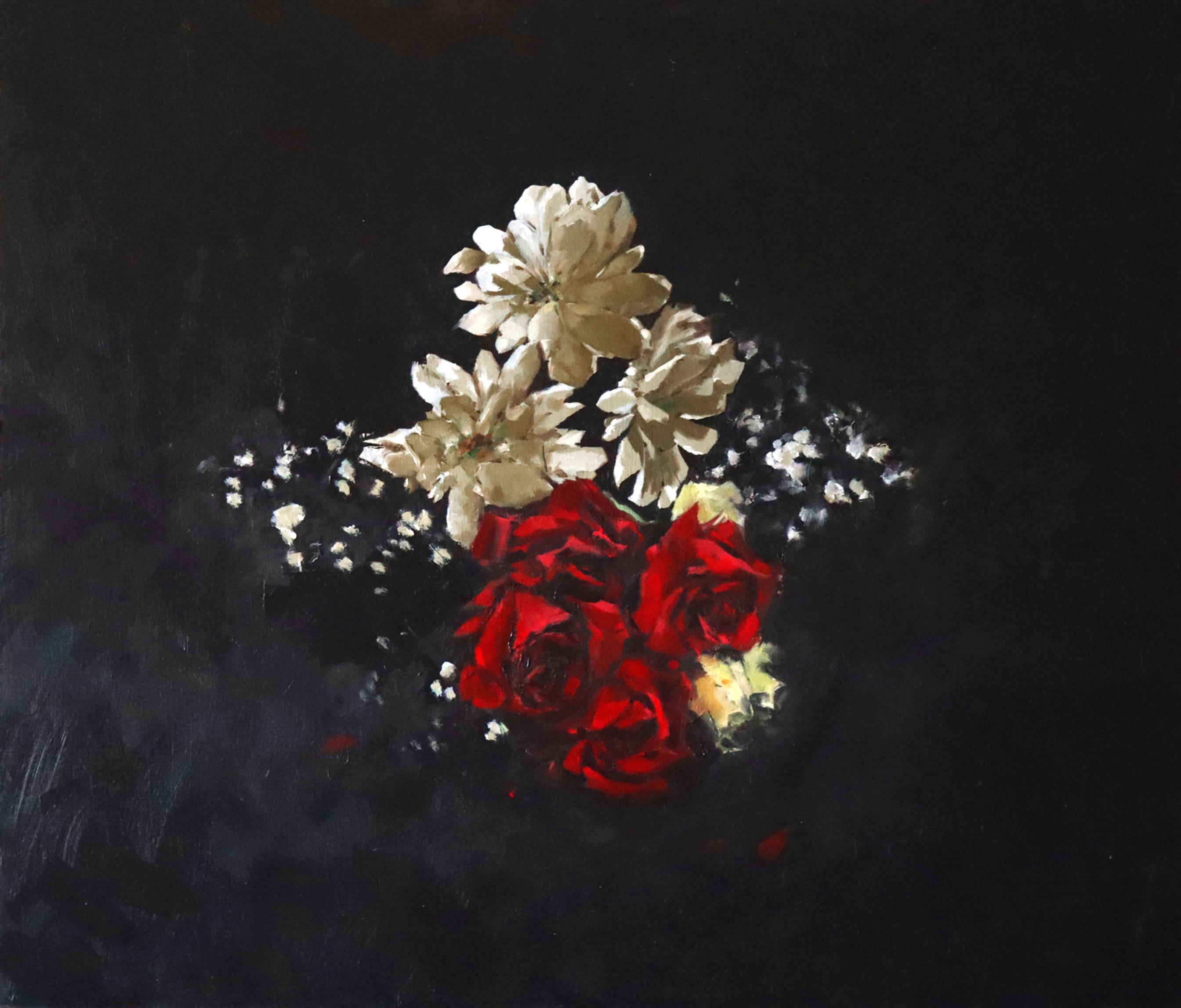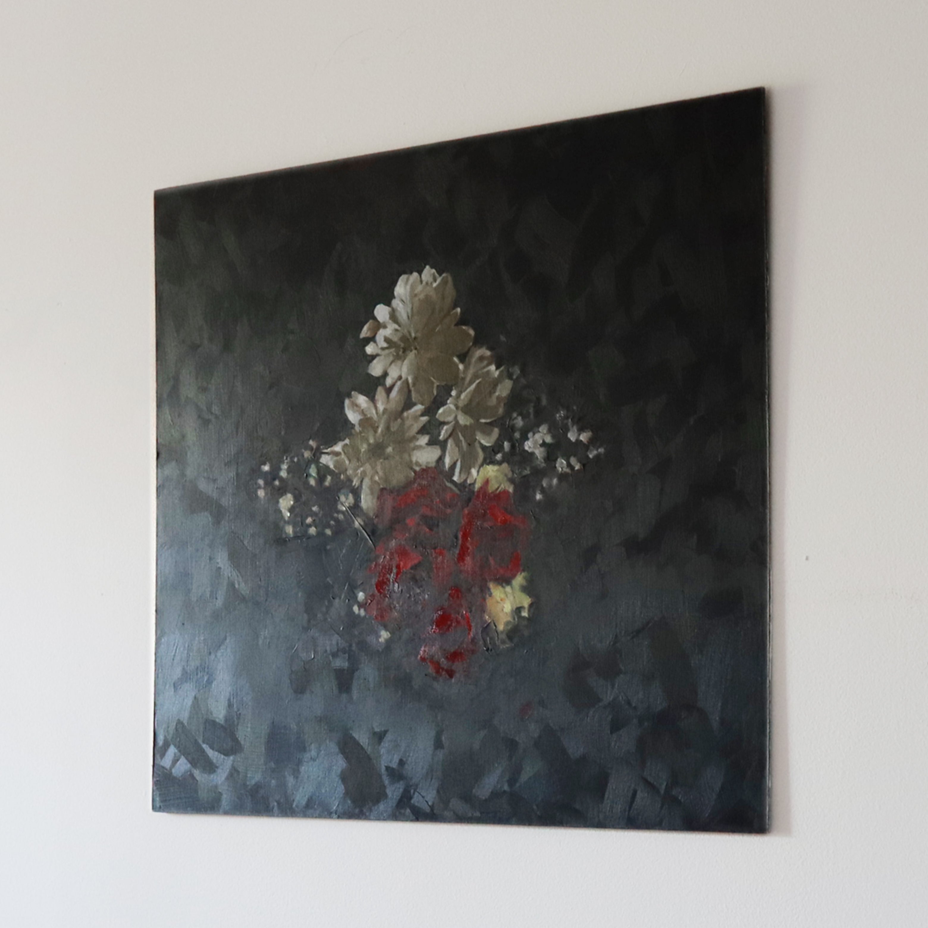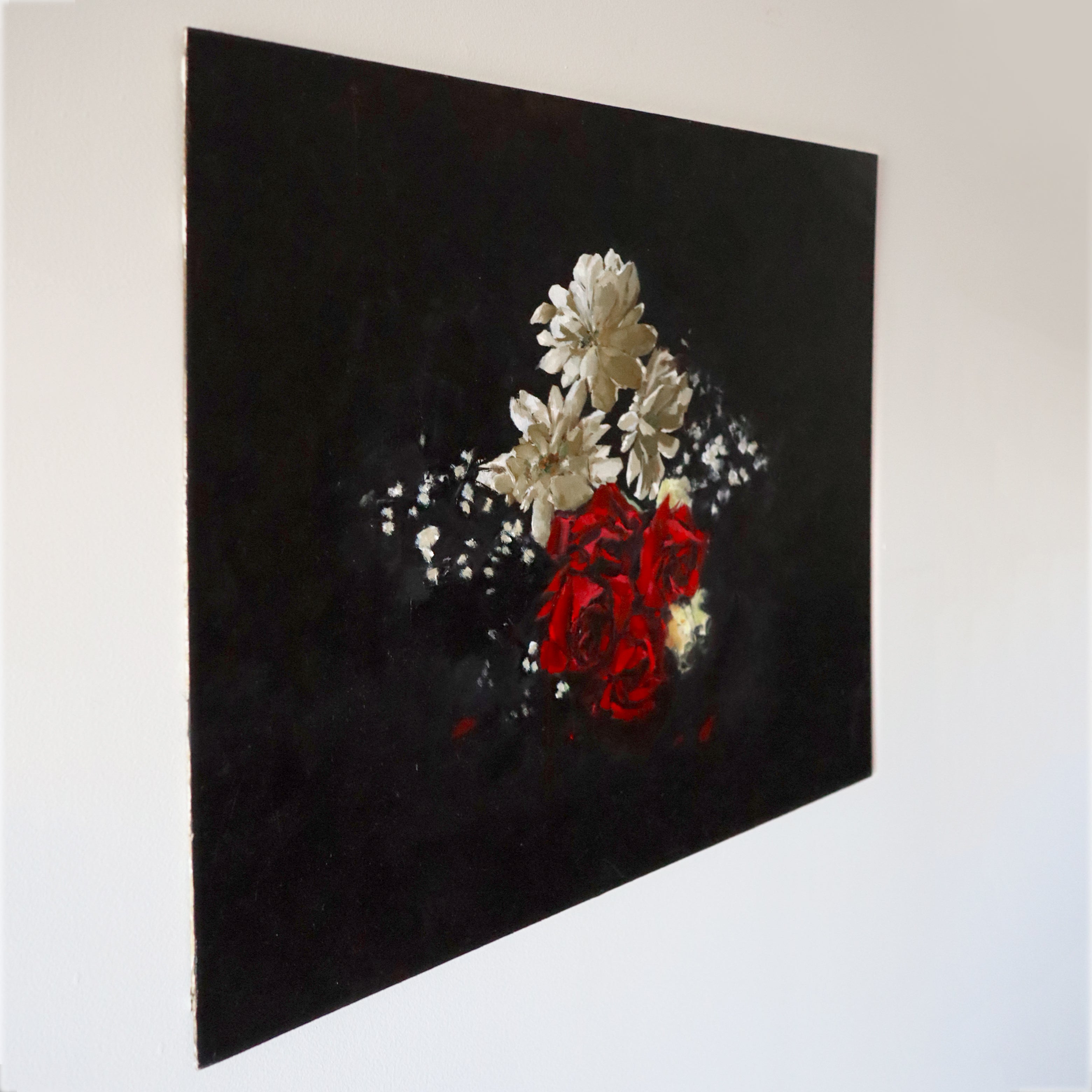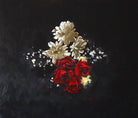 Bouquet is an original piece painted for my solo exhibition in Montreal. The exhibition examined the theme of "Study in the Arts". This particular painting was one of three still lifes painted for the show. The still life represents a long-standing tradition in painting, and has been revisited by contemporary artists in the form of abstractions, photography and even performance pieces and installations. For this piece I drew upon my classical artistic training with the Atelier de Bresoles to breathe a sense of tradition to the work. The dark background, the brushwork within it and the desaturated hues of the leaves and stems maintain the feel of the more surrealist work I typically create, while the vivid reds and bright cream petals retain the gaze. Oil on Masonite panel 24 X 20 in. 2022 For viewing, please book an appointment by email. Professional framing is recommended for this piece as Masonite can bend with humidity fluctuations. This movement is normal and does not affect the work of art.