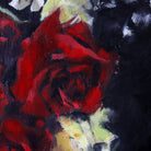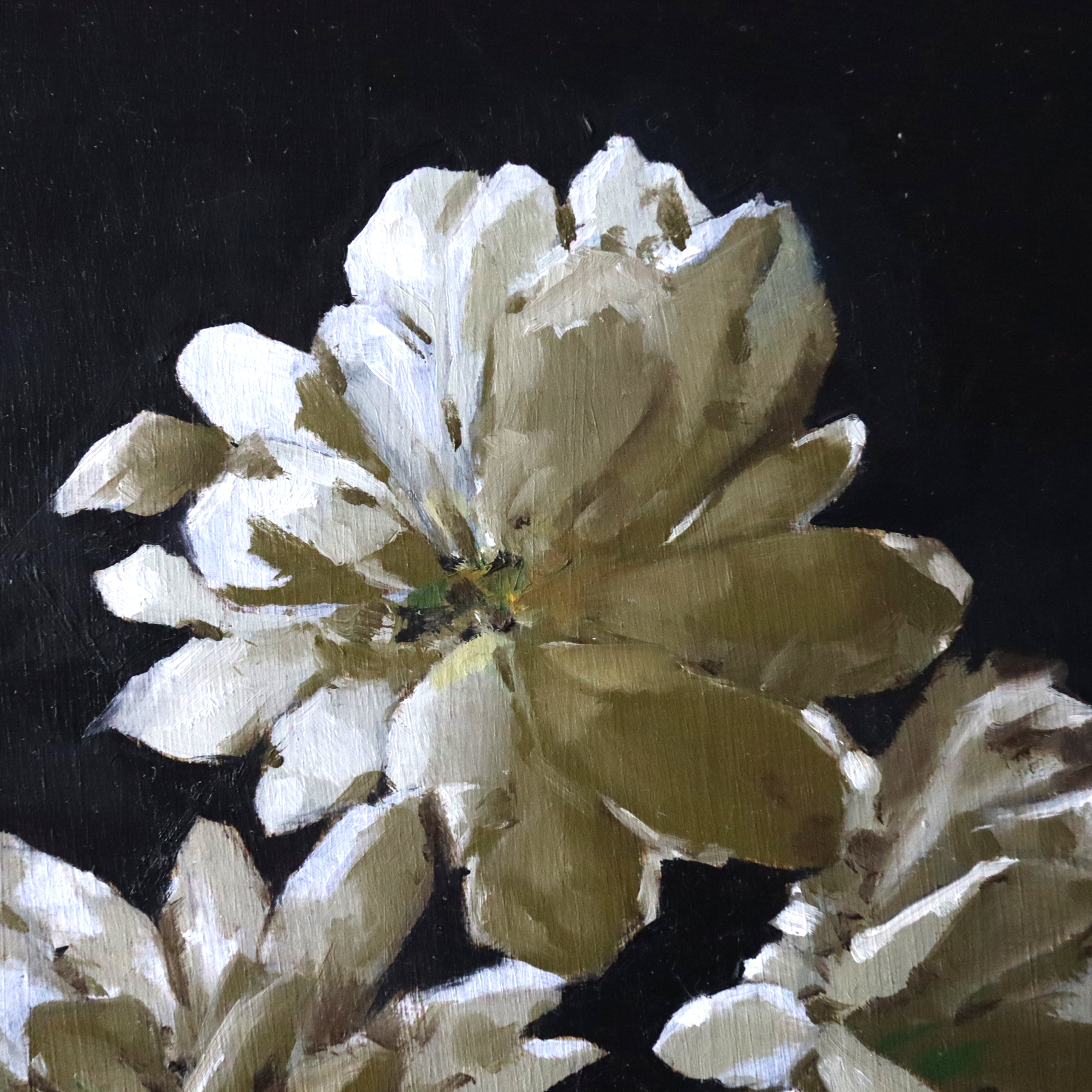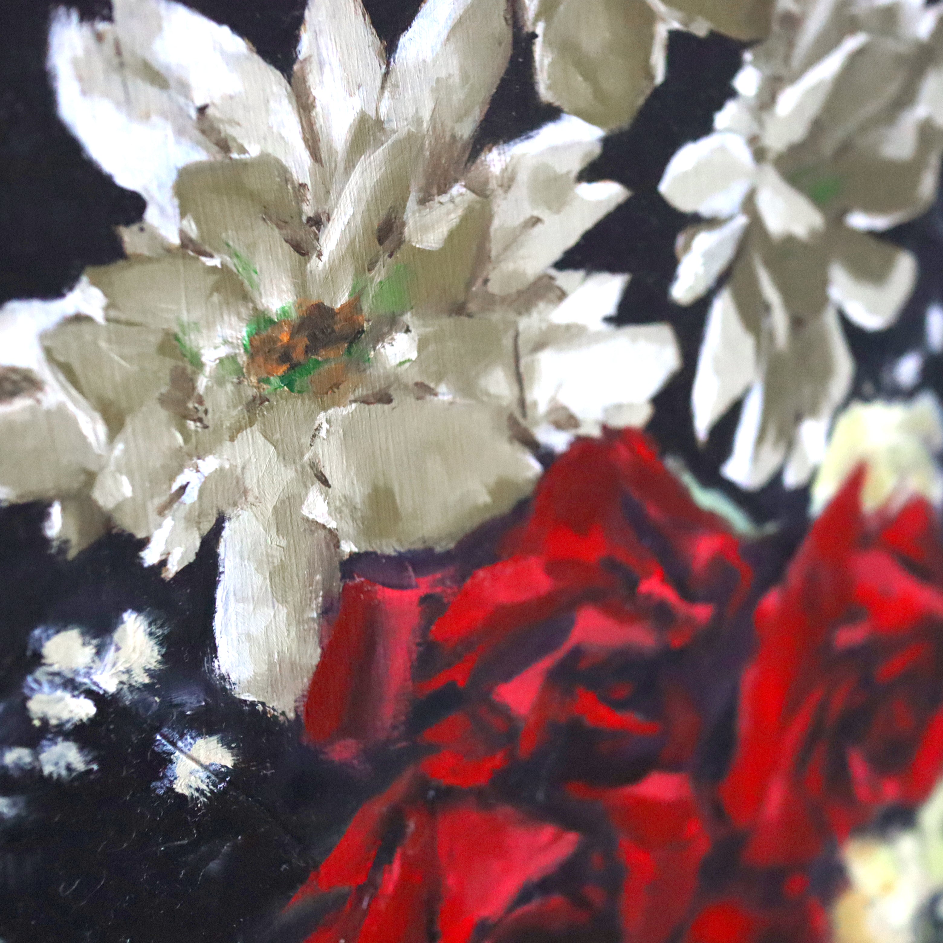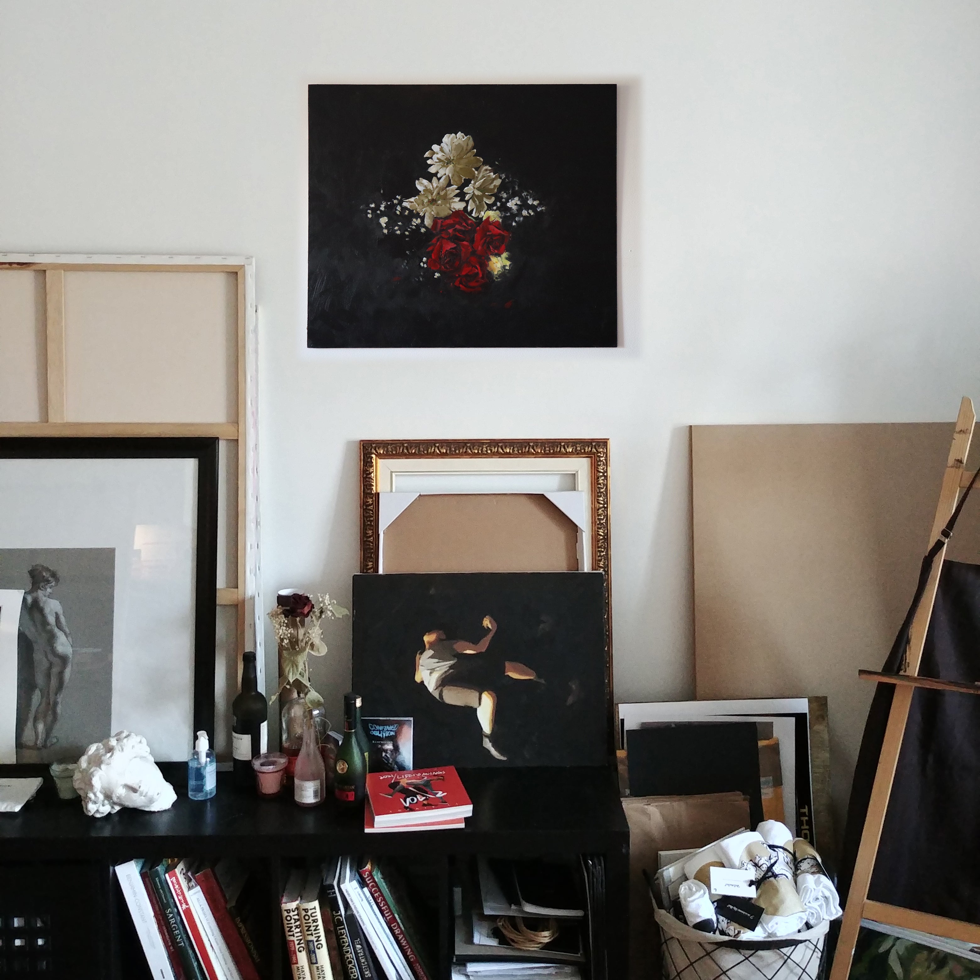 Bouquet is an original piece painted for my solo exhibition in Montreal. The exhibition examined the theme of "Study in the Arts". This particular painting was one of three still lifes painted for the show. The still life represents a long-standing tradition in painting, and has been revisited by contemporary artists in the form of abstractions, photography and even performance pieces and installations. For this piece I drew upon my classical artistic training with the Atelier de Bresoles to breathe a sense of tradition to the work. The dark background, the brushwork within it and the desaturated hues of the leaves and stems maintain the feel of the more surrealist work I typically create, while the vivid reds and bright cream petals retain the gaze. Oil on Masonite panel 24 X 20 in. 2022 For viewing, please book an appointment by email. Professional framing is recommended for this piece as Masonite can bend with humidity fluctuations. This movement is normal and does not affect the work of art.