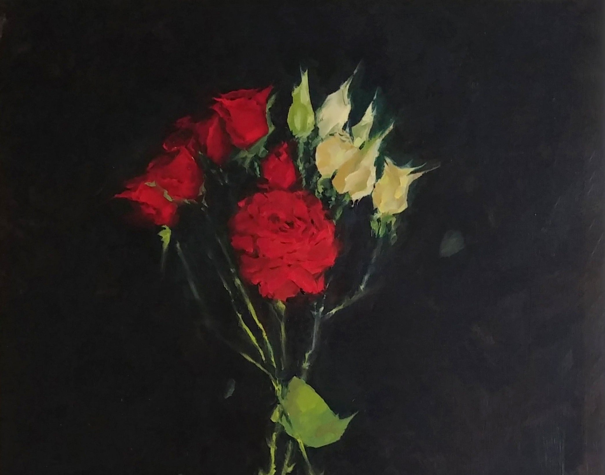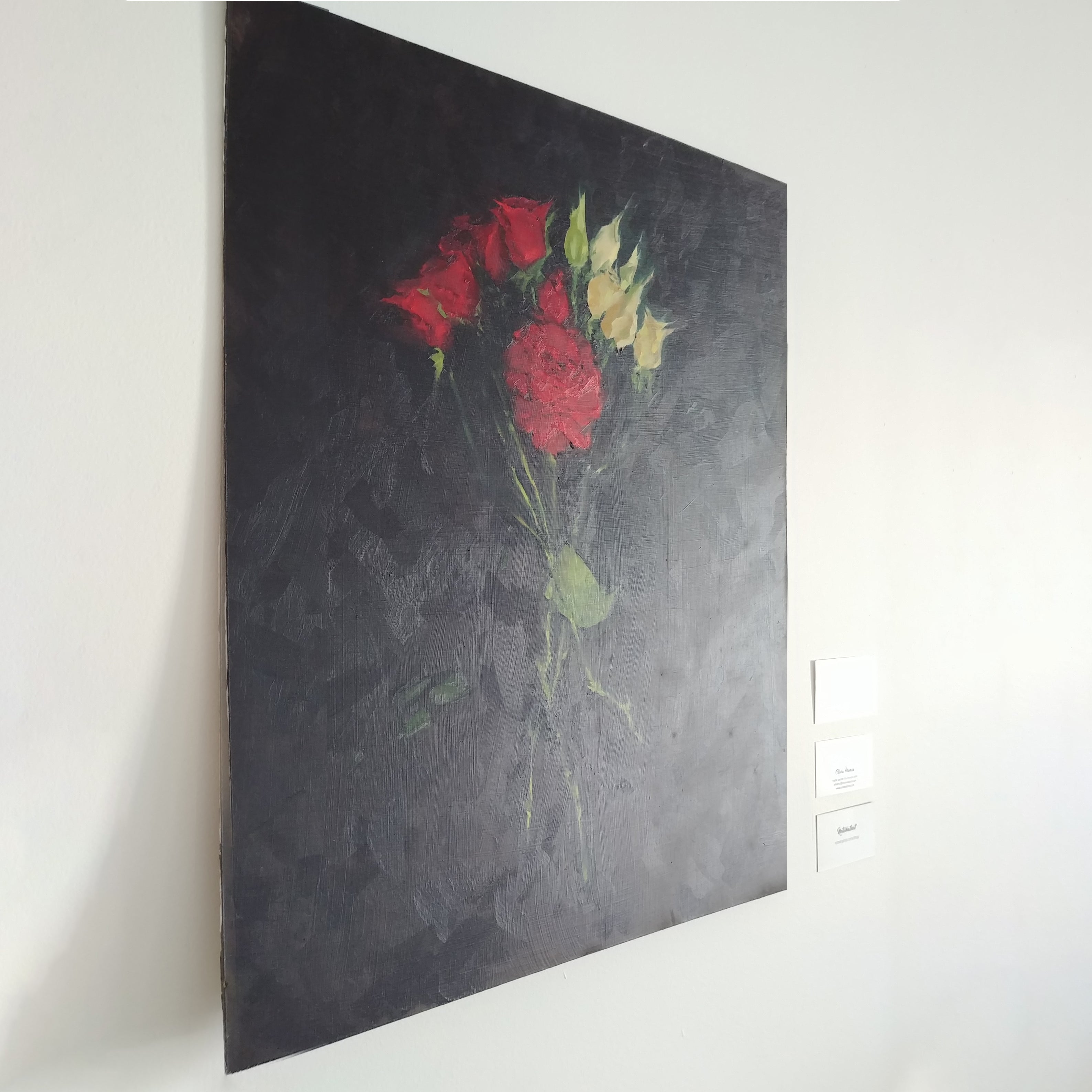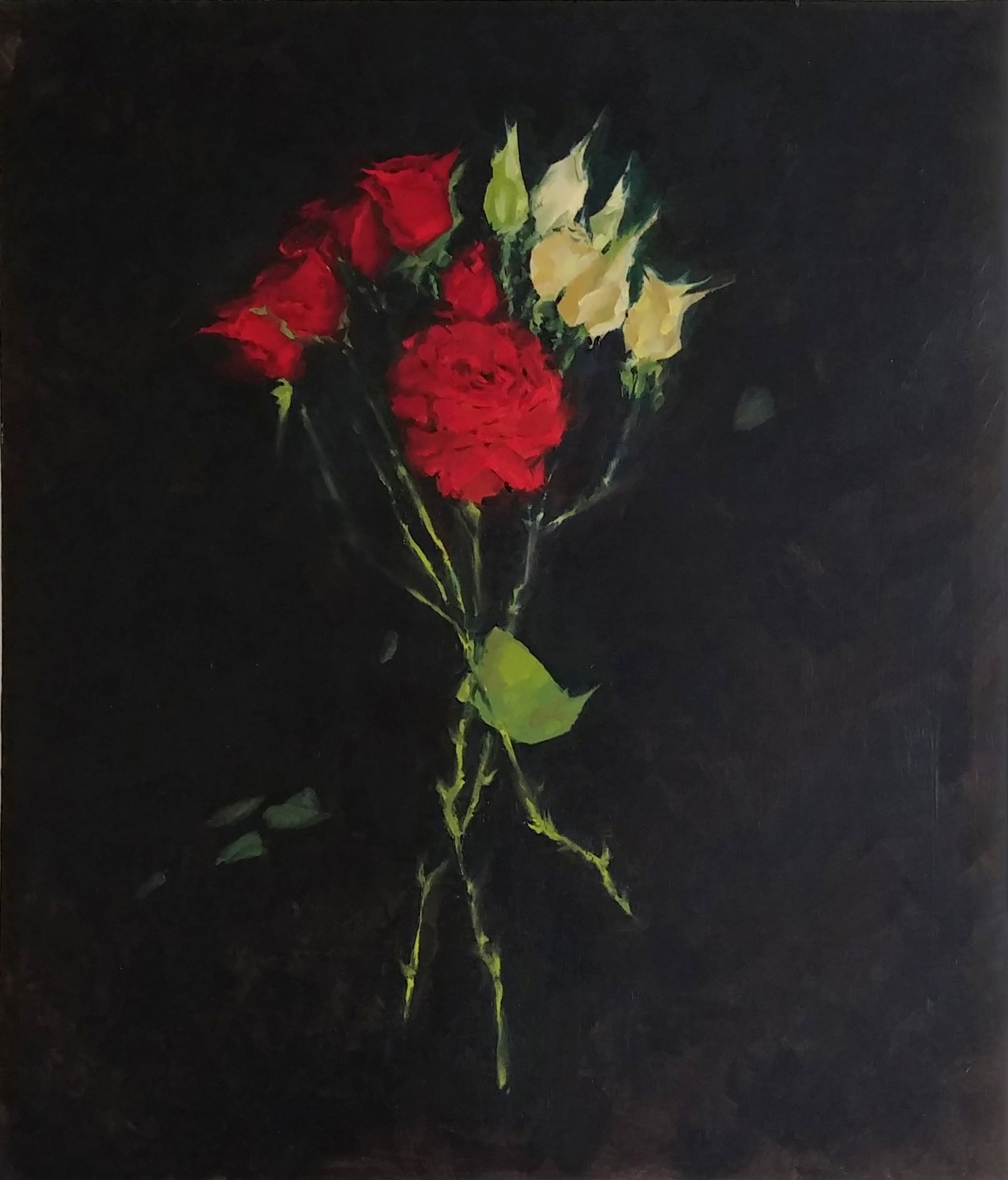 For this piece I drew upon my classical artistic training with the Atelier de Bresoles to breathe a sense of tradition to the work. The dark background, the brushwork within it and the desaturated hues of the leaves and stems maintain the feel of the more surrealist work I typically create, while the vivid reds and bright cream petals retain the gaze.