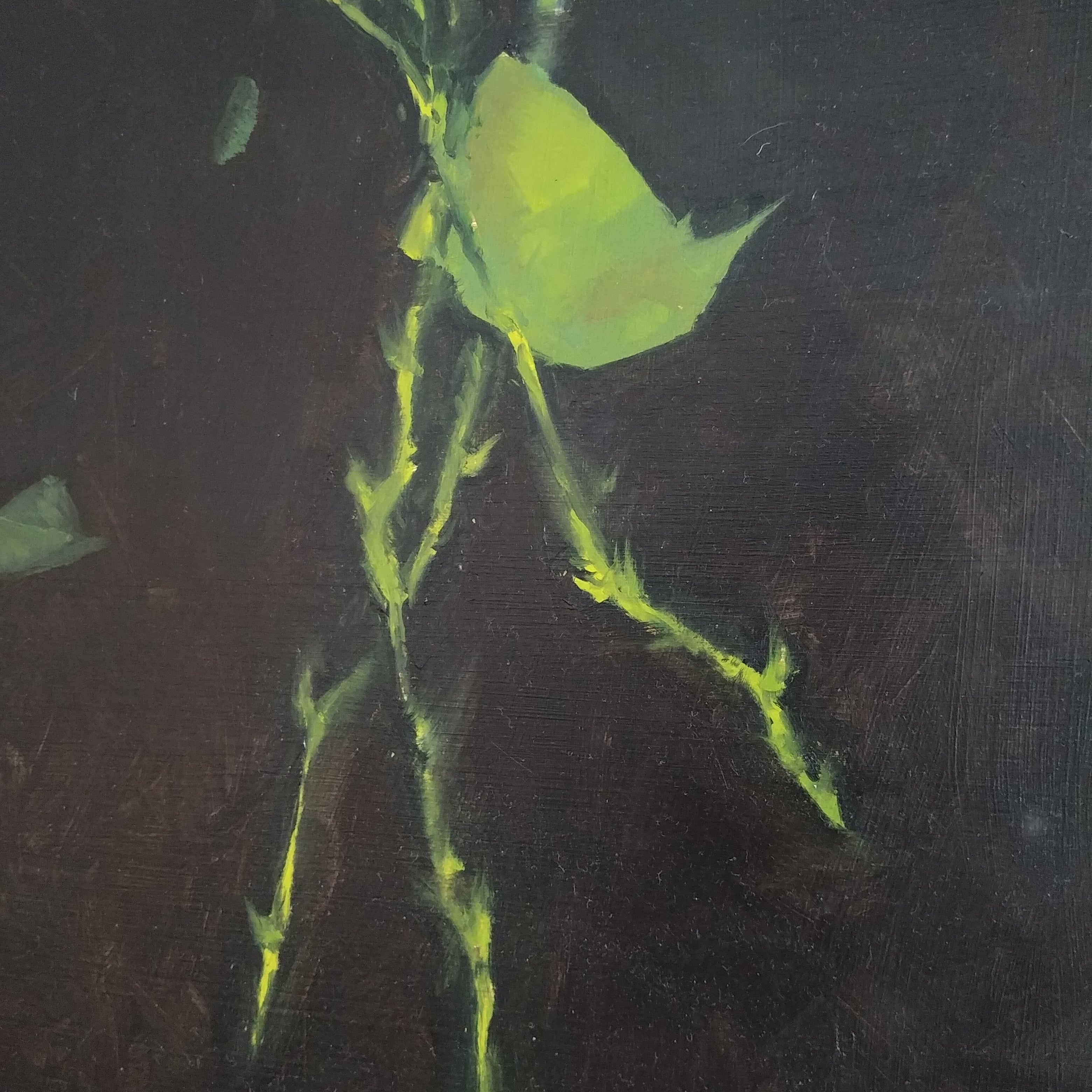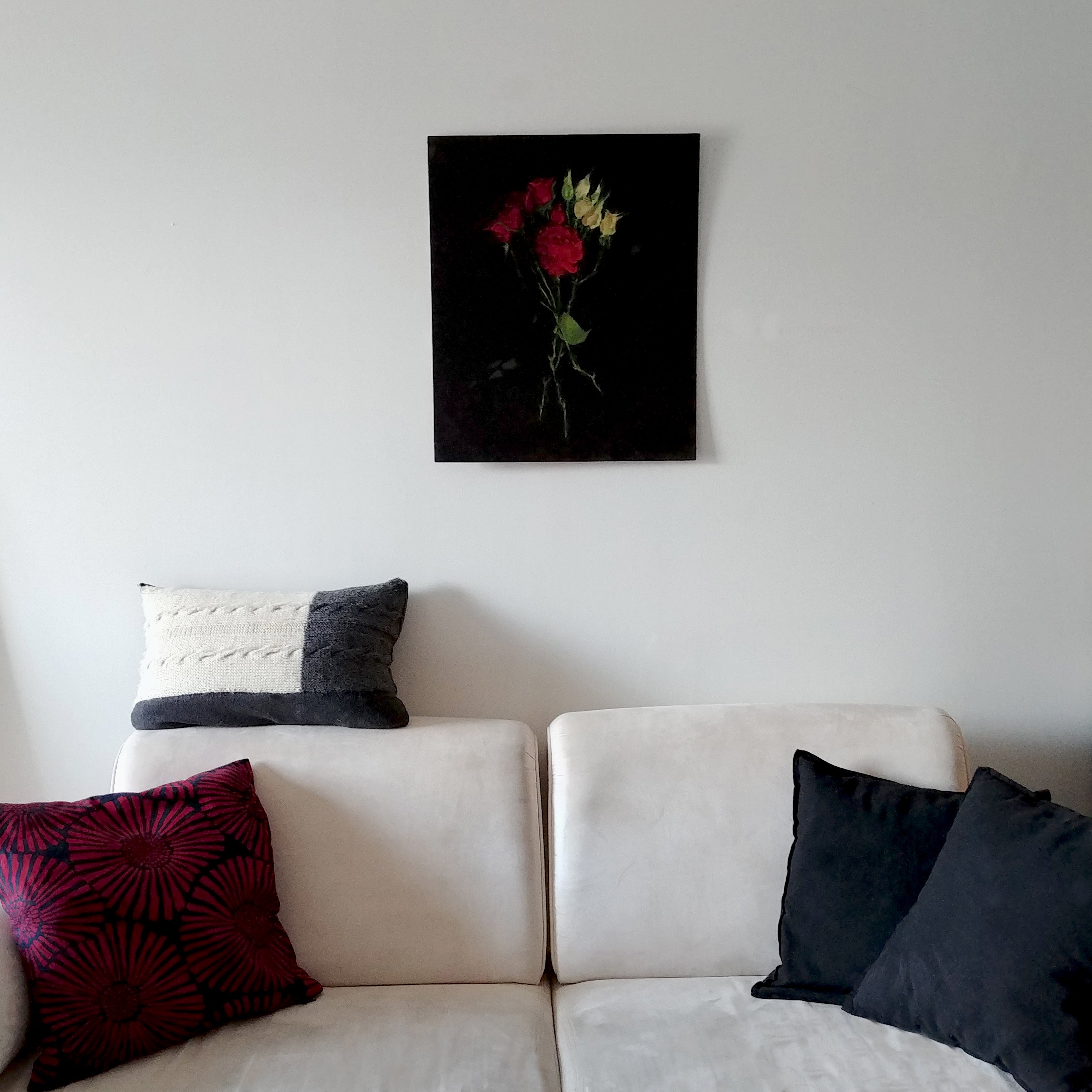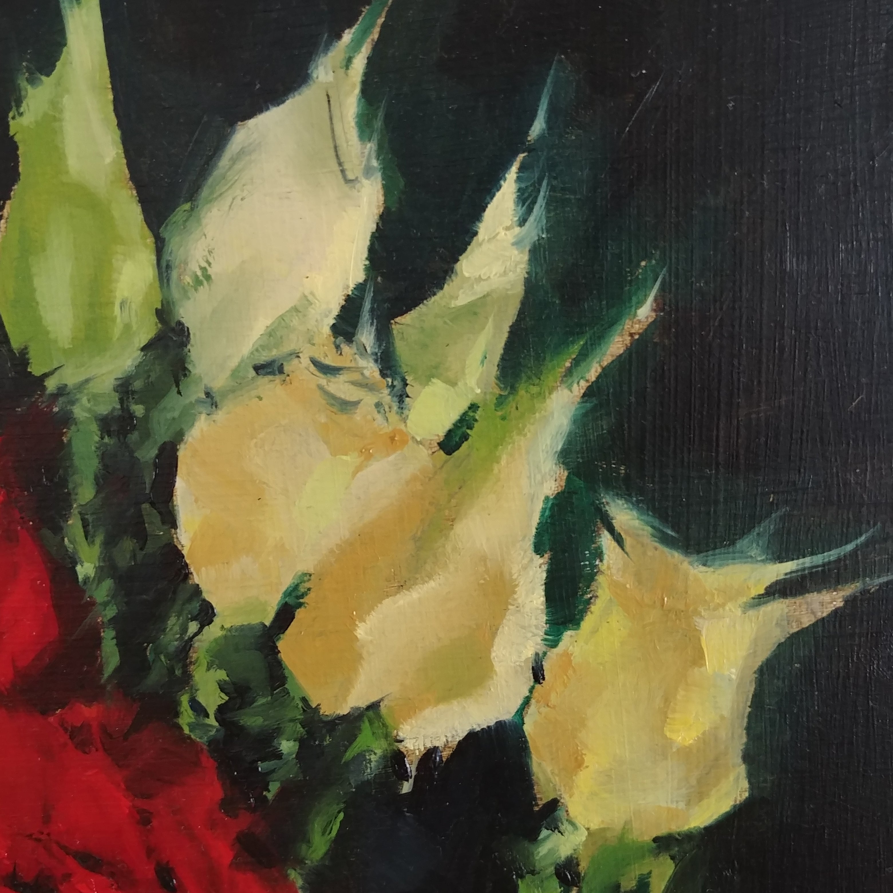 For this piece I drew upon my classical artistic training with the Atelier de Bresoles to breathe a sense of tradition to the work. The dark background, the brushwork within it and the desaturated hues of the leaves and stems maintain the feel of the more surrealist work I typically create, while the vivid reds and bright cream petals retain the gaze.