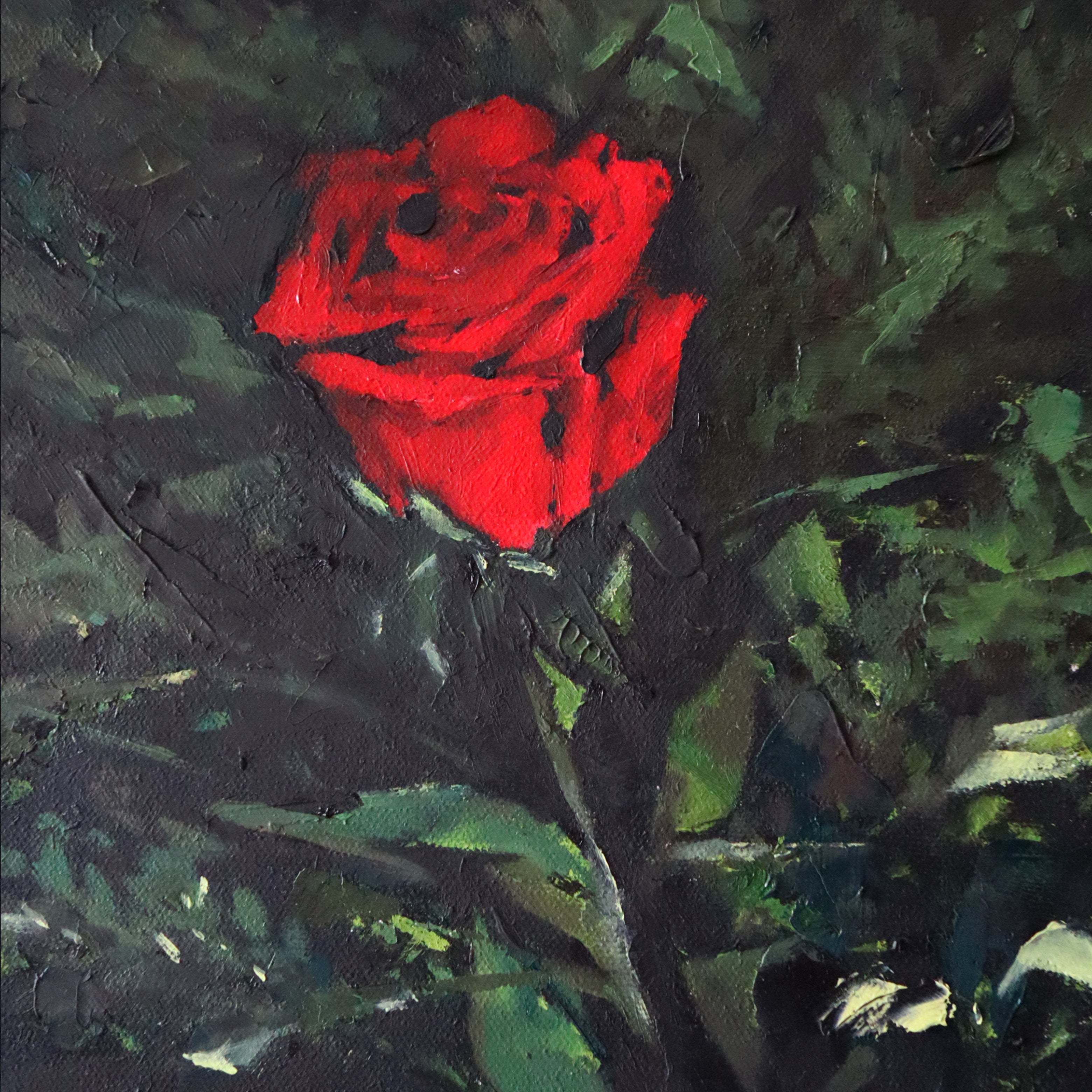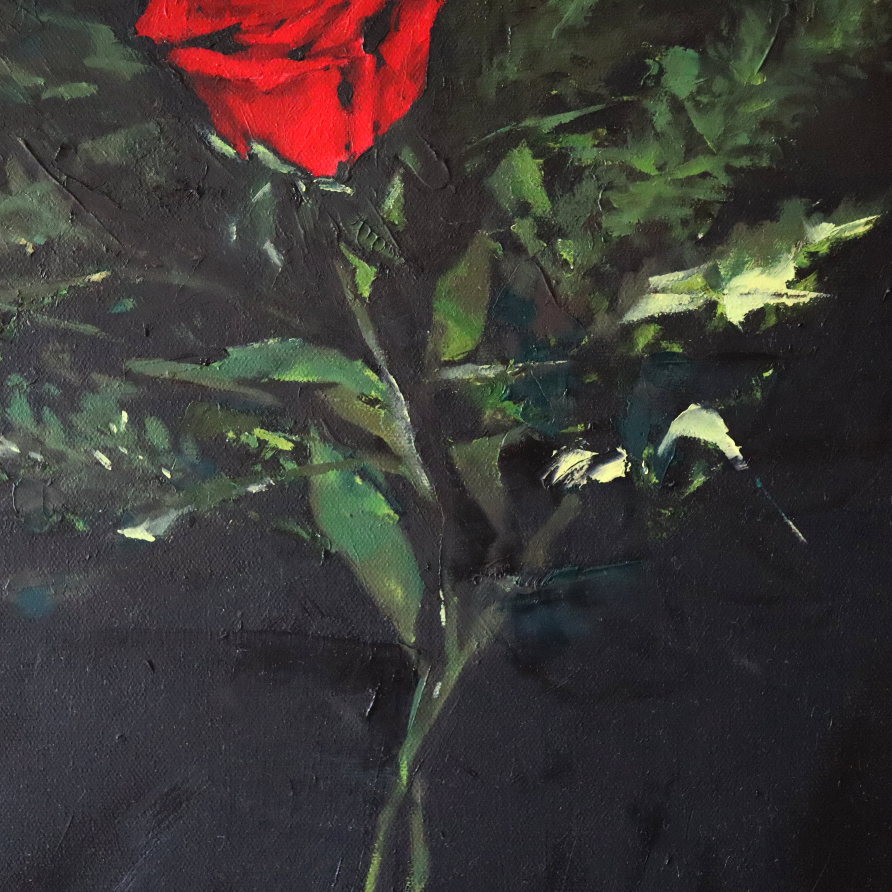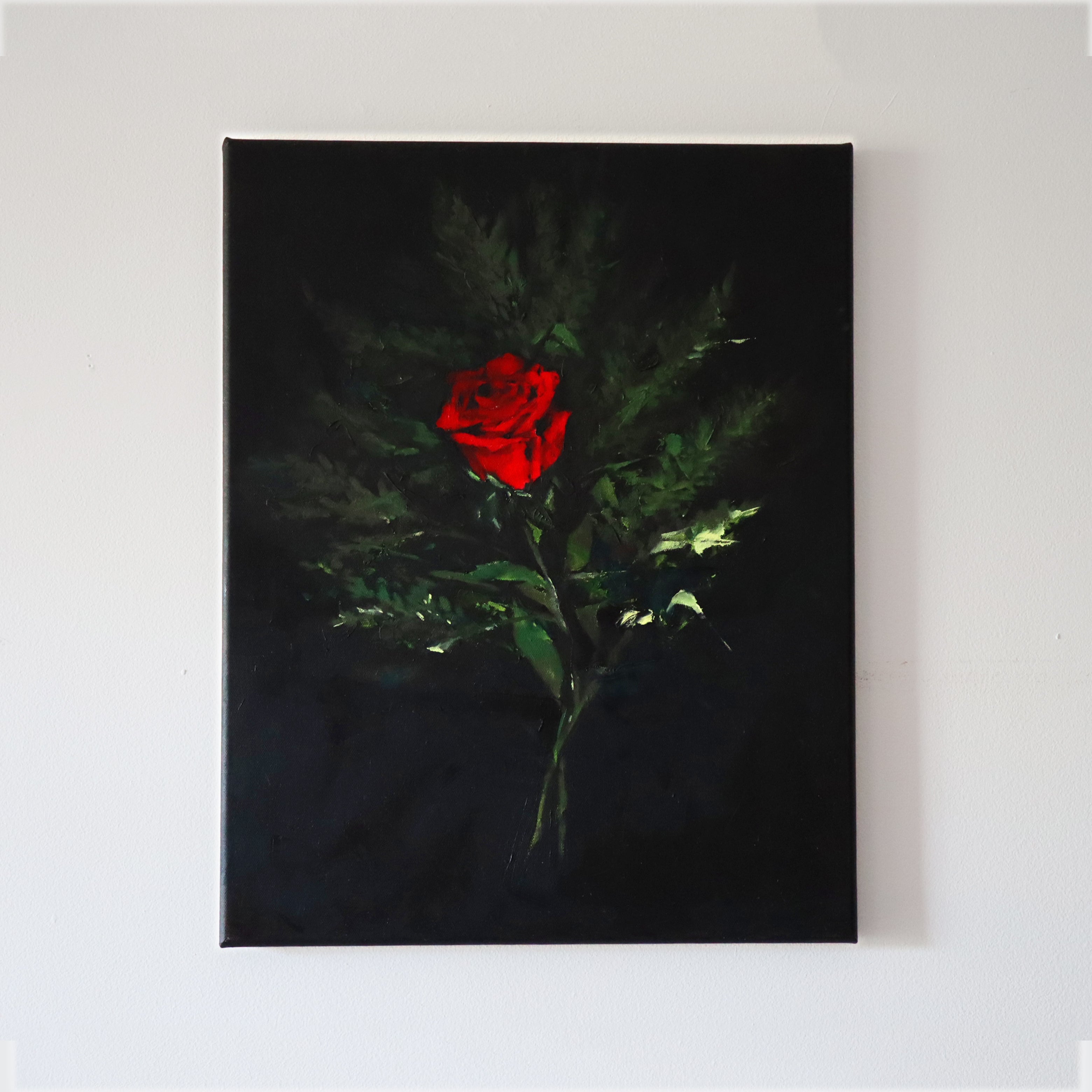 Composition with a Rose is an original piece painted for my solo exhibition in Montreal. The exhibition examined the theme of "Study in the Arts". This particular painting was one of three still life's painted for the show. The still life represents a long-standing tradition in painting, and has been revisited by contemporary artists in the form of abstractions, photography and even performance pieces and installations. For this piece I drew upon my classical artistic training with the Atelier de Bresoles to breathe a sense of tradition to the work. The dark background, the brushwork within it and the desaturated hues of the leaves and stems maintain the feel of the more surrealist work I typically create, while the vivid reds and bright cream petals retain the gaze.