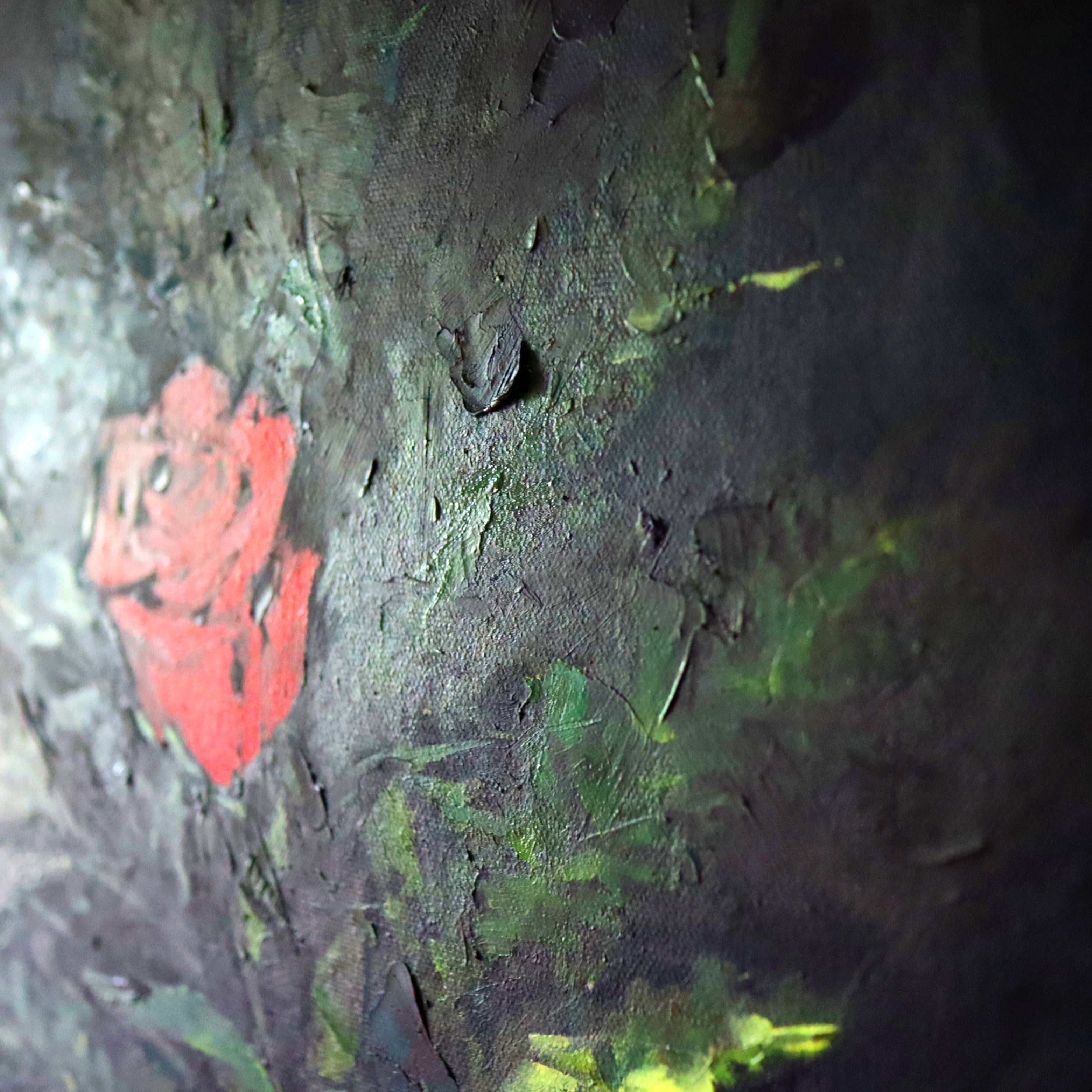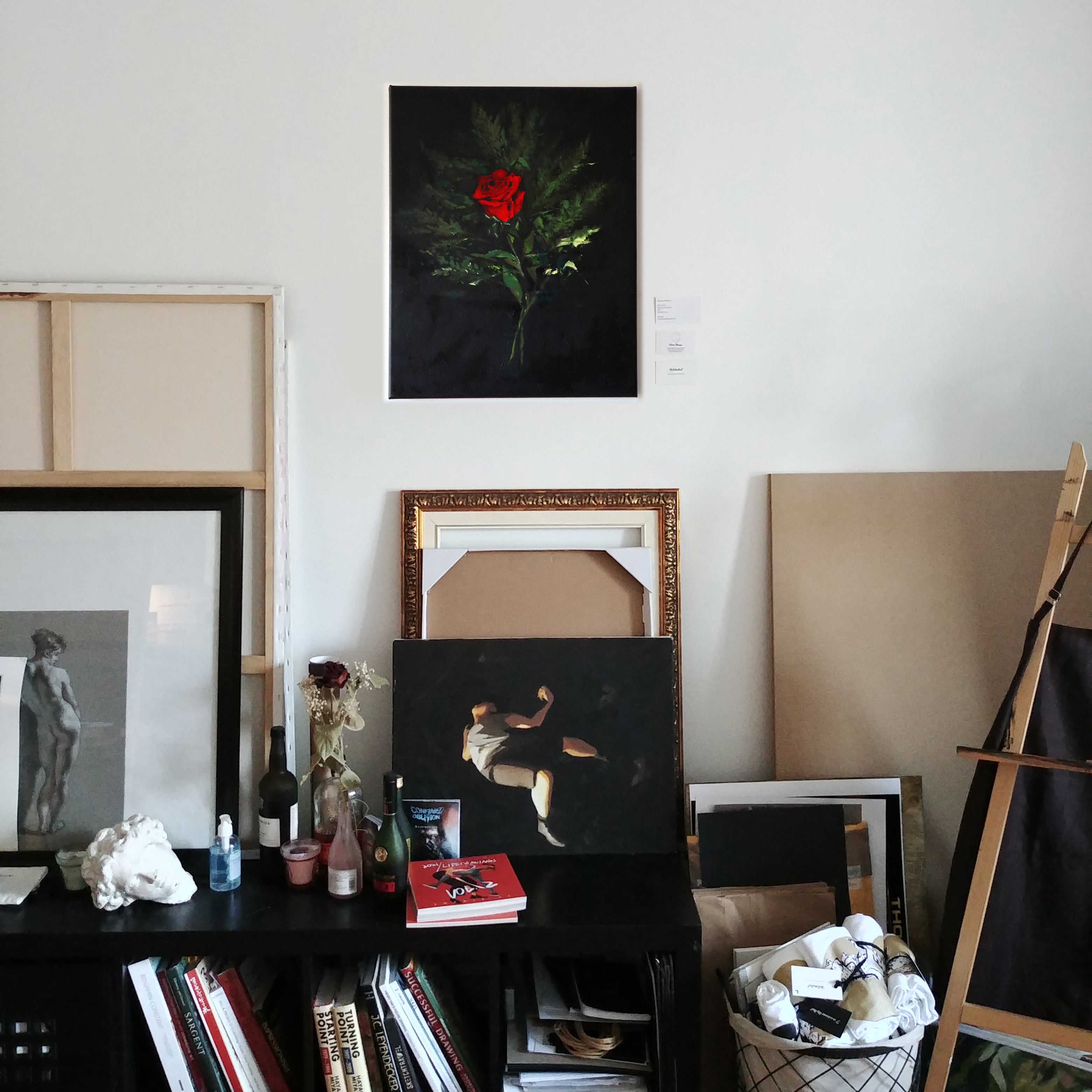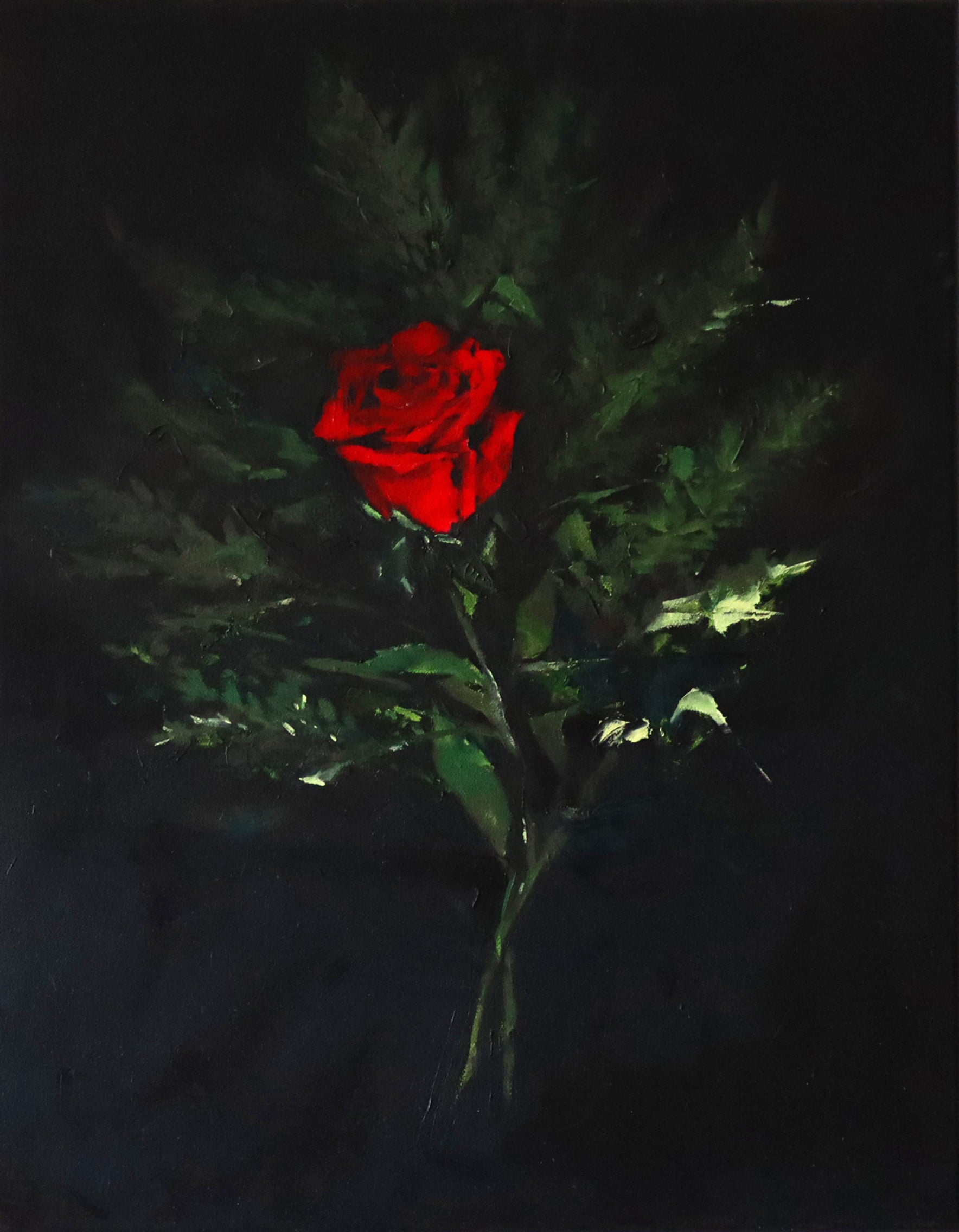 Composition with a Rose is an original piece painted for my solo exhibition in Montreal. The exhibition examined the theme of "Study in the Arts". This particular painting was one of three still life's painted for the show. The still life represents a long-standing tradition in painting, and has been revisited by contemporary artists in the form of abstractions, photography and even performance pieces and installations. For this piece I drew upon my classical artistic training with the Atelier de Bresoles to breathe a sense of tradition to the work. The dark background, the brushwork within it and the desaturated hues of the leaves and stems maintain the feel of the more surrealist work I typically create, while the vivid reds and bright cream petals retain the gaze.
